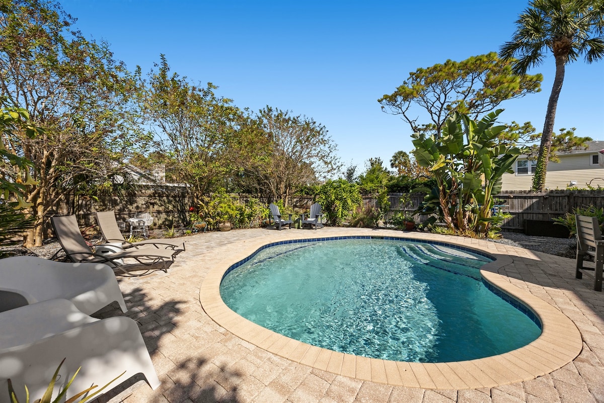 Sailfish is a serene 4BR/2.5BA retreat just 11 blks from the beach. Relax in your private oasis with a heated pool, putting green, pergolas, & outdoor dining. Head inside to bright open living spaces and a fully stocked kitchen. Upstairs, enjoy a king primary suite plus 3 other guest rooms. Game room fun and beach gear included - your perfect mix of comfort and coastal adventure. Dog friendly: We warmly welcome four-legged canine friends. No cats, please. (They don't like the beach!)