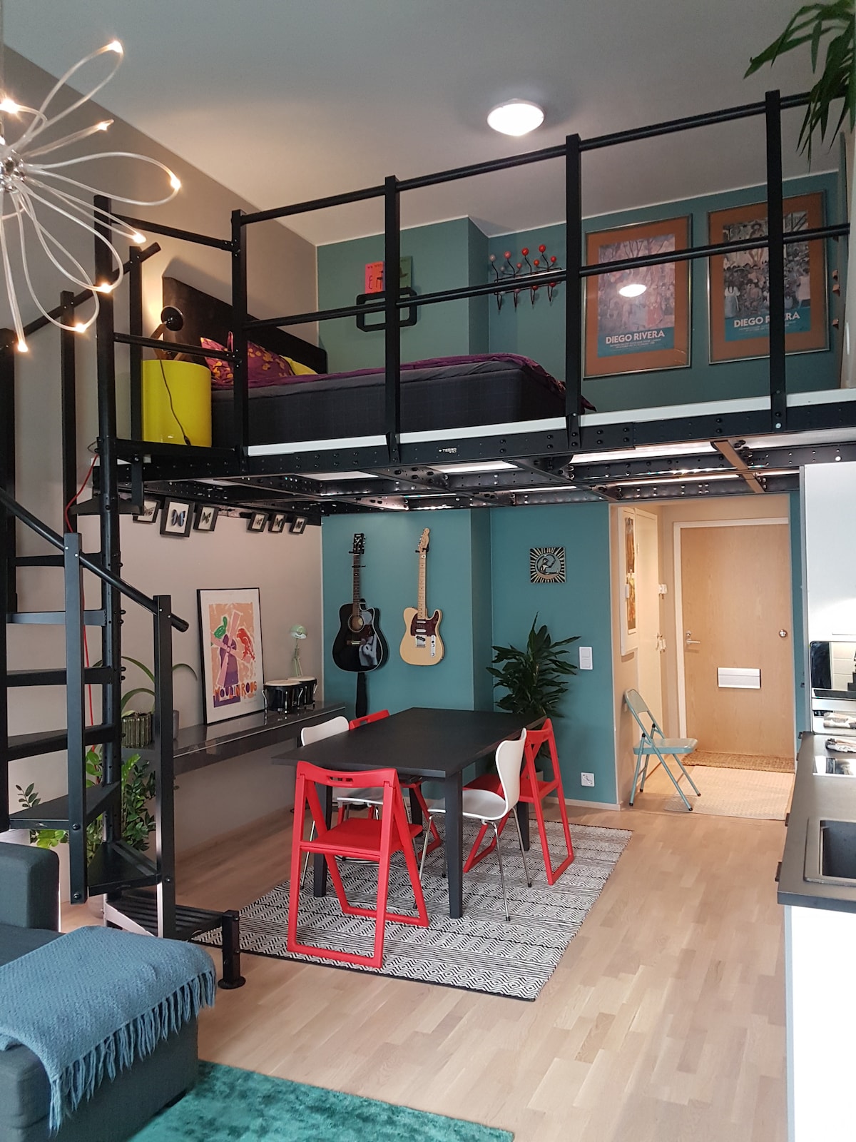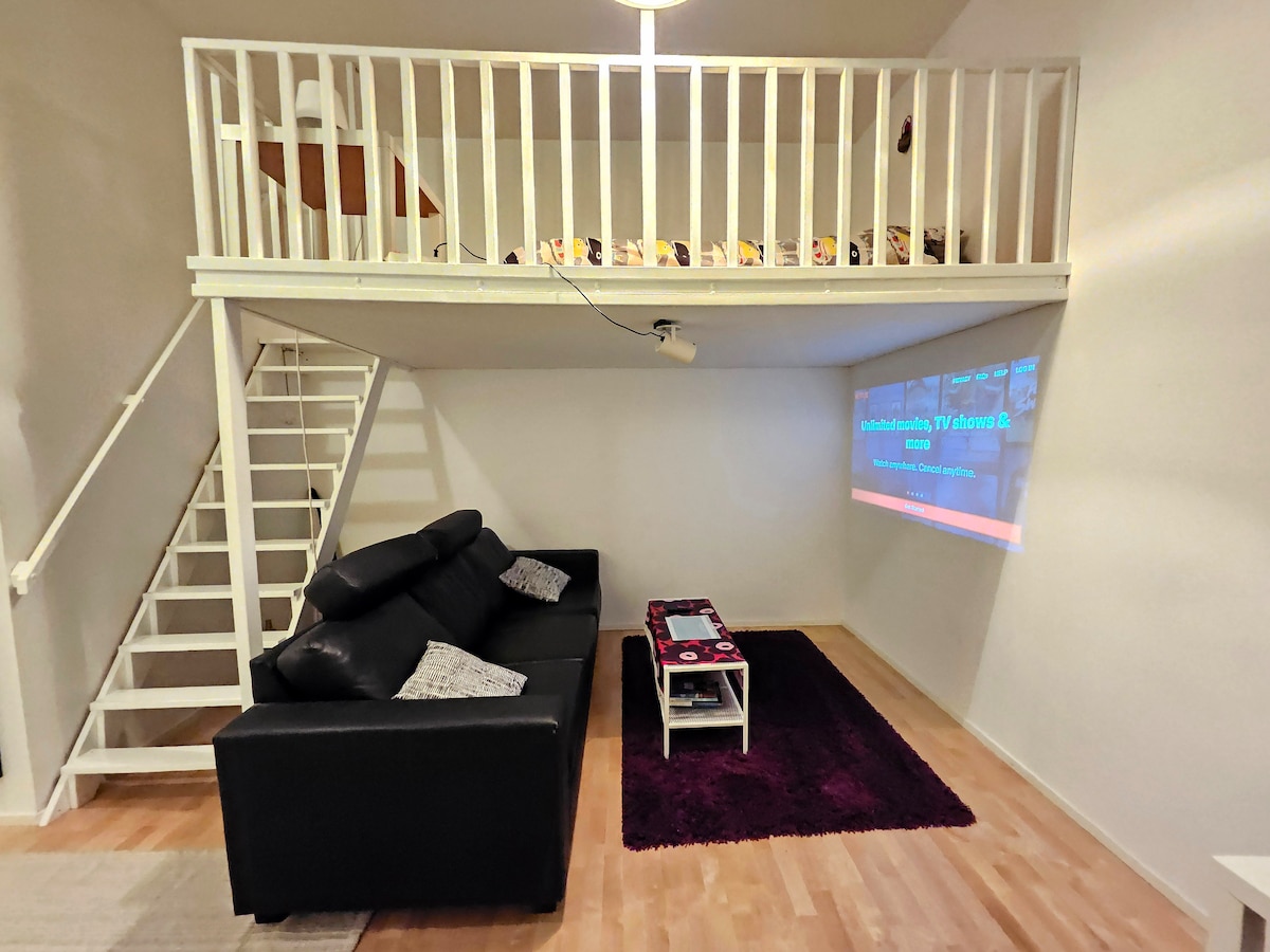 Tämän ainutlaatuisen loft asunnon huonekorkeus kohoaa yli neljän metrin korkeuteen. Käytössäsi on uutukainen suuri yksiö, joka jakautuu luontevasti olohuoneeseen, ruokahuoneeseen, keittiöön, sekä yläkerrassa olevaan täyskorkeaan makuutilaan. Keittiö on täysin varusteltu, tiskikone löytyy, sekä uuni/mikroaaltouuni että kahvikapselikone. Asunnossa on tilava kylpyhuone, ja isommalle porukalle mahdollisuus nukkua myös vuodesohvalla. Ratikka 9 tuo lähes kotiovelle!