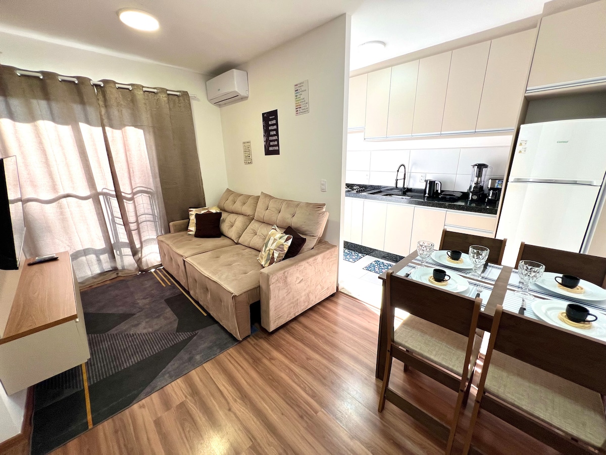 Cameras com monitoramento no pátio. Ambiente excl. para pernoite/moradia (proib. atividade comercial ou ilegal). De brinde!!!! fornecemos um pote de café, açúcar e sal para uso. Somente pet de pequeno porte. Quarto com ar cond. Q/F com uma cama de casal, sala com sofá cama, Banheiro, cozinha/sala ar condic. F, Área ext. com sacada, máq. lavar roupas. localiz., prox. mercado, fac., Prati Donaduzzi, do lago municipal. Não permitido festa no local.