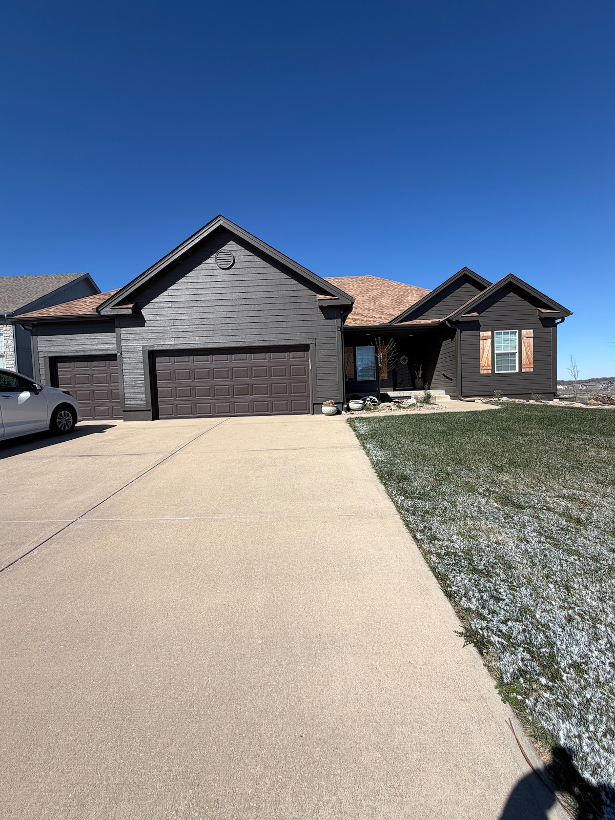 Árasán príobháideach iontach in íoslach (solas an lae go páirteach) Garáiste agus Seomra Folctha! Tá 2 sheomra ann (Leaba lán i gceann amháin, dhá leaba shingil sa cheann eile). Cistinéad ina bhfuil cuntair, doirteal, cuisneoir beag, micreathonnán agus bord/cathaoireacha! Tá seomra folctha príobháideach ann freisin nach bhfuil comhroinnte! Teach Feirme Nua-Aimseartha. Eastát geataithe le capaill, loch agus 15 acra síochánta! 10 nóiméad ó Bhialanna/ Siopadóireacht ag K7 agus Sante Fe, 20 nóiméad go Lawrence, 2 nóiméad go Kill Creek Park. In aice le Gléasra Panasonic. Tá seomraí eile ar fáil freisin.