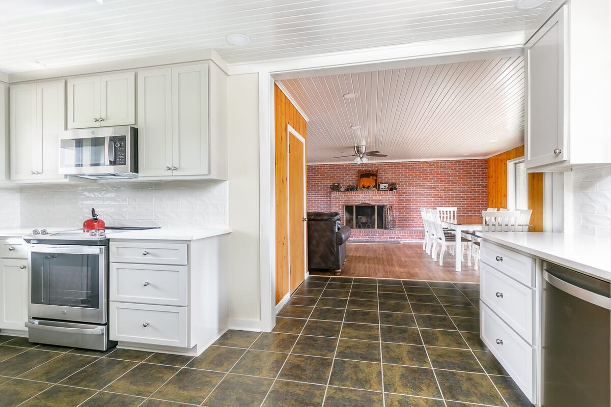 3 theach BR/2 BA, cistin iomlán le fearais dhosmálta, meaisín níocháin agus triomadóir, miasniteoir, diúscairt bruscair, Wi - Fi saor in aisce, Teilifís Dhíreach, Teilifís Chliste (1). Lár - Aeir & Teas. Siúlóid álainn 2.5 acra stocáilte céimeanna ón bpóirse tosaigh. Cé iascaireachta, poll dóiteáin le cathaoireacha Adirondack. Ample páirceáil le spás do do bhád. Úsáideann gríoscán débheach BBQ gás nó gualach. Réadmhaoin atá oiriúnach do theaghlaigh! Ní cheadaítear fiach ar bith. Caithfidh sé a bheith 28 le ligean ar cíos.