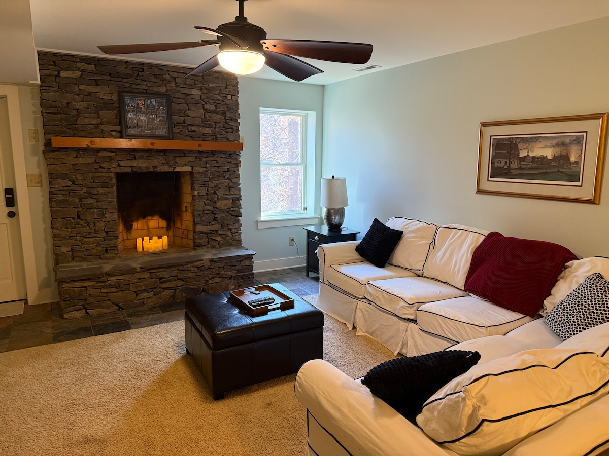 Rinneamar an teach feirme seo ó na 1940idí a athchóiriú go grámhar in Elkin, atá suite díreach nóiméad ó chuid de na fíonlanna is fearr in Carolinas Thuaidh! Tá na saoráidí go léir againn chun tú a chur ar do shuaimhneas. Tar éis lá lán le fíonlann a thógáil, tar ar ais agus bain sult as níos mó fíona agus cáise sa chistin álainn nua fhairsing, nó scíth a ligean ar ais ag an bpoll dóiteáin, ag glacadh isteach na radhairc fhairsinge! Tá baile gleoite Elkin suite nóiméad ar shiúl le haghaidh bia agus siopadóireachta, nó téigh ag fánaíocht ag Sliabh na Cloch!