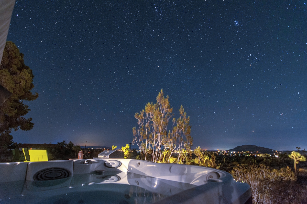 Tum thú féin sa teach sómasach 3 sheomra leapa, 2 sheomra folctha nua - thógtha seo, ina bhfuil fuinneoga fairsinge a nochtann na tírdhreacha iontacha, linn snámha agus spá iontach téite le haghaidh tumthaí réaltaí, agus spás aclaíochta tiomnaithe. Scaoil faoi spéartha gan deireadh ar 2 acra spraoiúla i d'aisling phríobháideach féin, foirfe do chruinnithe stargazing agus paitió. Dúisigh le héirí gréine iontacha, déan iniúchadh ar iontais eile Joshua Tree, ansin fill le haghaidh soak athnuachana i do thearmann fásaigh.