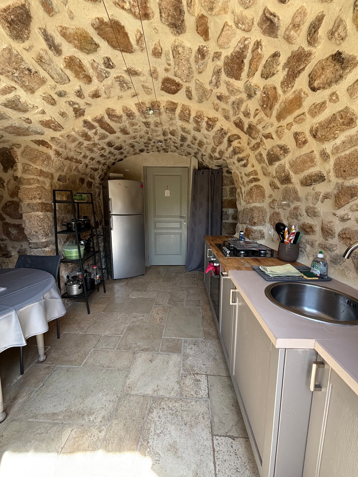 Ag imeall an Bois de Païolive, an fhoraois seo an - sean ina sreabhann Abhainn Chassezac, gheobhaidh tú amach ag casadh cosáin ar áirse aisteach atá suite ar charraigeacha atá snoite le chreimeadh. Cuirfidh Pauline fáilte romhat chuig an gcocún beag éiceolaíoch neamhghnách compordach seo. Deartha agus tógtha go hiomlán againn, tá na bunriachtanais ann chun cúpla lá a chaitheamh i gcroílár ciúin an dúlra. Caitheamh cloiche ar shiúl: snámh, rothaíocht sléibhe, fánaíocht, dreapadóireacht, curachóireacht, dreapadóireacht crann, srl...