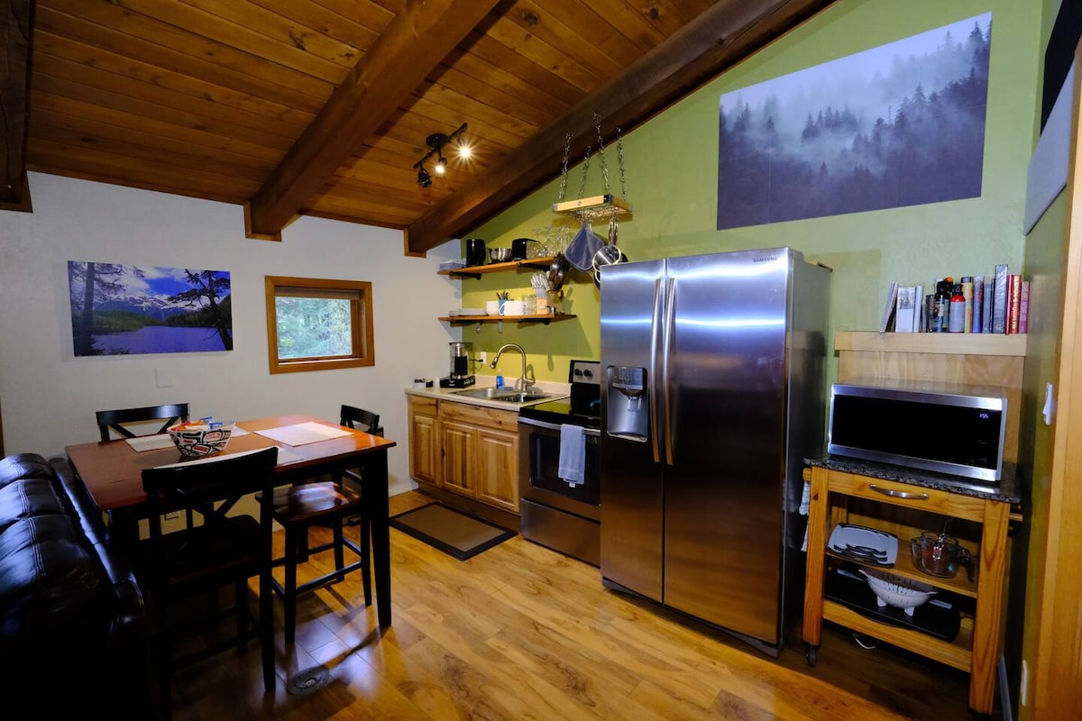 Fáilte chuig ár n - árasán cluthar Alaskan! Níl ár dteach 1000 troigh chearnach ach thart ar 10 nóiméad ar shiúl ón tsiopadóireacht agus ón aerfort, agus gar do chosáin agus do thránna in aice láimhe. Níl ach 3 nóiméad go dtí críochfort Alaska State Ferry! Tar éis lá taiscéalaíochta, tar ar ais agus lig do scíth sa tobán te nó faigh oíche mhaith chodlata i do leaba rímhéide chompordach. Cuir d'fhanacht in áirithe linn agus faigh blaiseadh d'áilleacht Alasca. Cistin rómánsúil, oiriúnach do theaghlaigh, lánfheistithe, athchóirithe as an nua agus réidh duit!