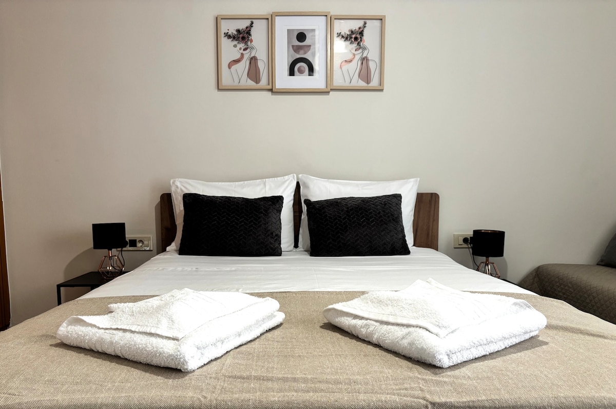 Árasán álainn grianmhar in aice le lár na cathrach!(4km )Ciúin le radharc iontach ar an bhfarraige,balcóin le binse, gairdín, 10 nóiméad ar bhus ó lár na cathrach!Foirfe do theaghlaigh agus do ghrúpaí cairde ar mian leo saoire spraíúil shuaimhneach a chaitheamh!Tá an teach díreach in aice le hollmhargadh, le stáisiún bus díreach faoin teach, a théann go lár na cathrach. Tá gach riachtanas ann do mhaireachtáil éasca. Spás páirceála sábháilte do ghluaisteáin/gluaisrothair.