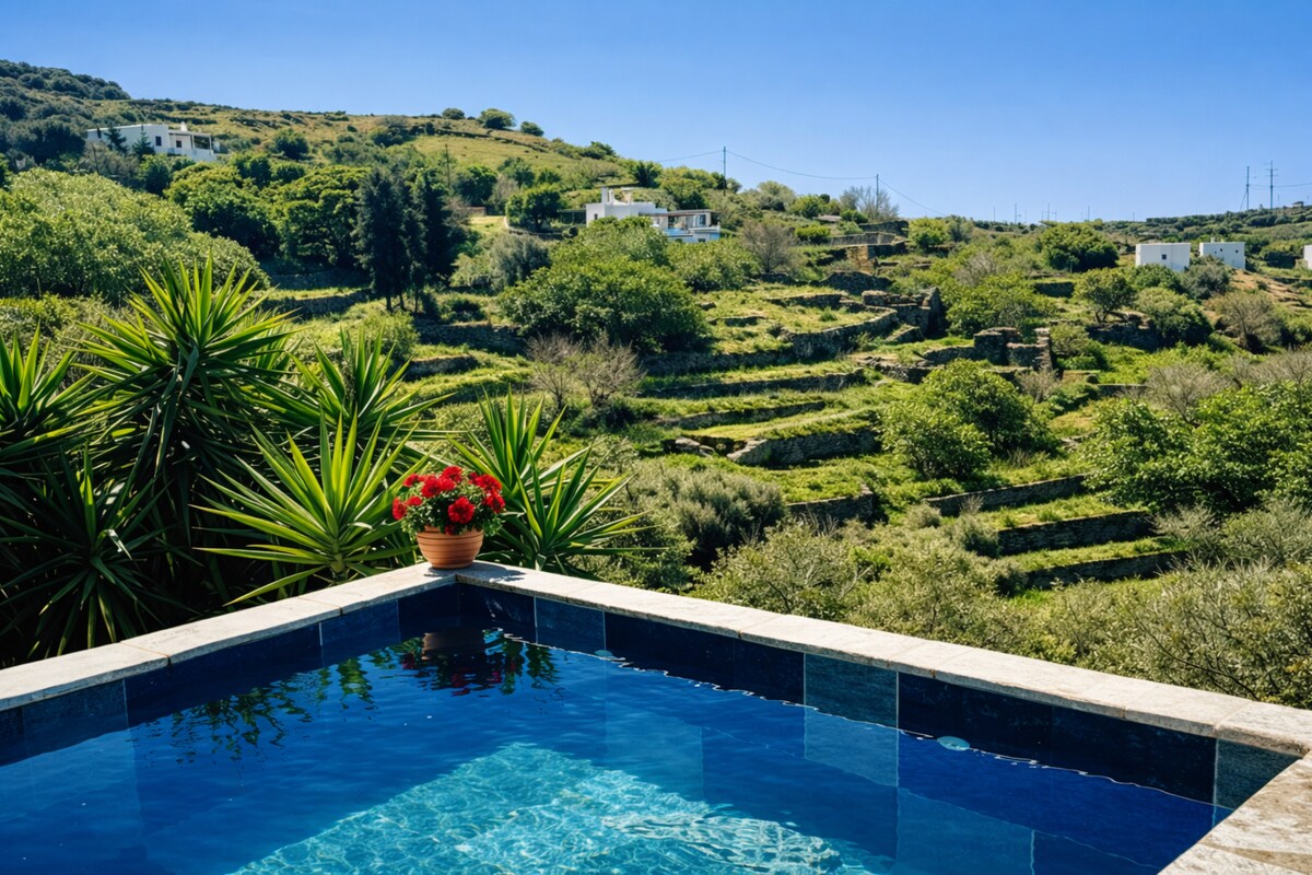 Tá an teach 55 méadar cearnach seo atá cairdiúil don chomhshaol suite 18 nóiméad sa charr ó chalafort Tinos, ar an taobh thiar den oileán, neadaithe i ngarrán olóige agus cliathánach le tírdhreach creagach agus radharc ar an Muir Aeigéach. Athdhearadh an teach feirme traidisiúnta seo i stíl íosta. Tá an spás oiriúnach do lánúin ar breá leis an tír ina gcónaí agus príobháideacht. Tugann sé deis do scíth a ligean ó shaol na cathrach, agus athcheangal a dhéanamh le simplíocht agus suaimhneas an dúlra agus an aireachais.