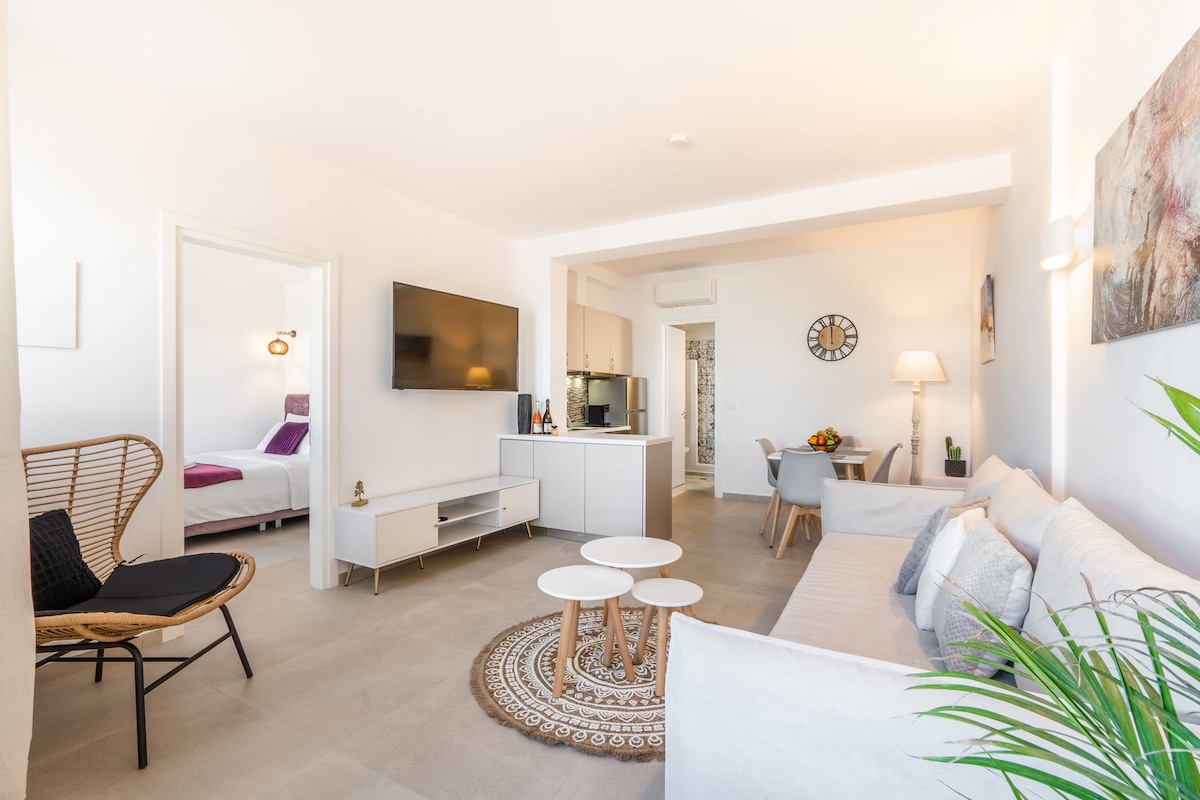 Is é an stiúideo radharc farraige deluxe a aisling a thagann fíor. Athmhúnlaithe go hálainn, ina bhfuil na saoráidí nua - aimseartha go léir, tá na seomraí seo ar chuid de na seomraí is áille in Kamari. Cistiní lánfheistithe, teilifíseáin ar scáileán cothrom, aerchóiriú éiceolaíoch, seomra folctha athchóirithe