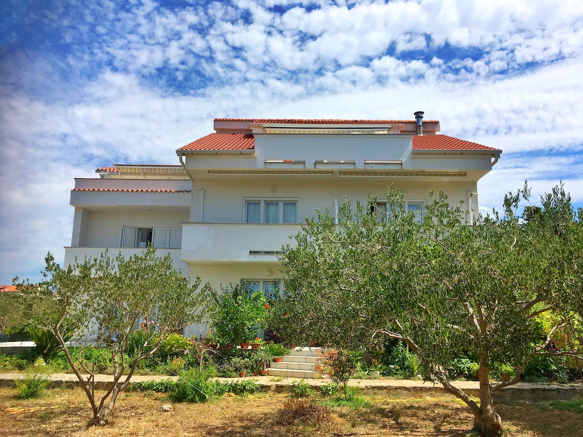 Tá ardán ollmhór ag an árasán lochta mór lonrach seo ar an dara hurlár le radharc iontach. Tá 2 sheomra leapa ann (gach ceann acu do 2 dhuine), seomra suí fairsing (agus seans ann go mbeidh duine amháin eile ar leaba thoilg), cistin, seomra folctha, idirlíon WI - FI saor in aisce agus áit pháirceála saor in aisce. Tá an chistin feistithe go hiomlán, le meaisín caife, oigheann micreathonnach, citeal uisce, miasa agus sceanra. Tá línéadach leapa san áireamh (athraithe uair sa tseachtain). Tá an trá is gaire 700 m ar shiúl, agus tá lár an bhaile 700m.
