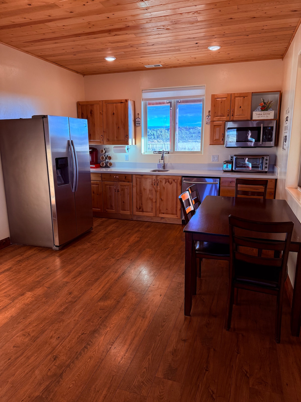 Stay in a Real Western Horse Barn! Experience rustic charm with modern comforts in this unique barn-turned-retreat. Handcrafted kitchen cabinets from reclaimed barn wood, custom-milled hardwood floors, and modern bathroom and bedroom finishes create the perfect mix of old and new. Relax on the deck under the stars and soak in the peaceful Western vibes. A one-of-a-kind getaway you won’t forget!