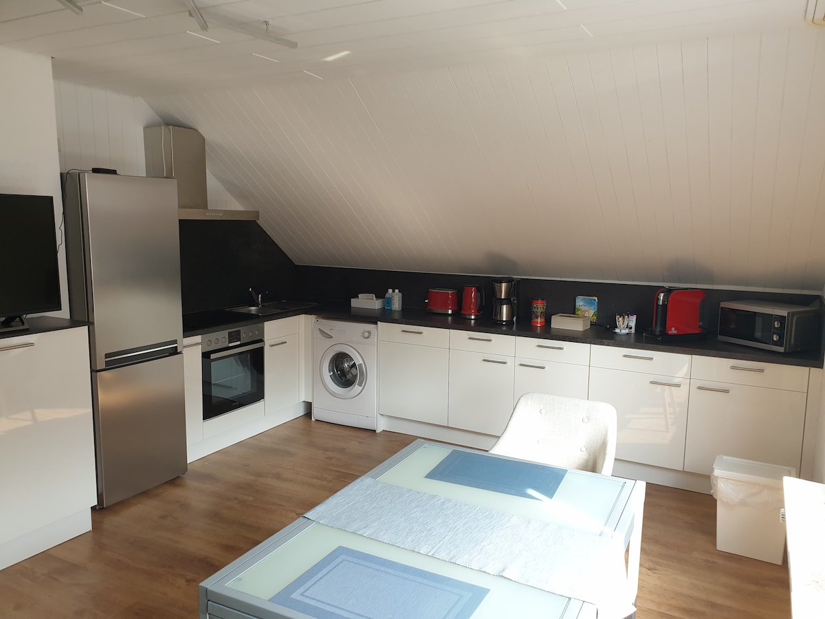 Tá an t - árasán mór 35 méadar cearnach suite ar an gcéad urlár den teach i sráid chiúin chónaithe in Willich - Münchheide. Go dtí an mórbhealach 44 = 5 nóiméad, go Messe Düsseldorf = 20 nóiméad. Tá sé feistithe go hiomlán, tá éadaí leapa, tuáillí, glanadh deiridh san áireamh. Tá an chistinéad le pláta te 2 - dóire, micreathonnán, tóstaer, citeal, déantóir caife agus gréithe oiriúnach chun bricfeasta nó béilí simplí a ullmhú Peataí: tá le do thoil v r a b le haghaidh eolais; do mhadra féin ar fáil
