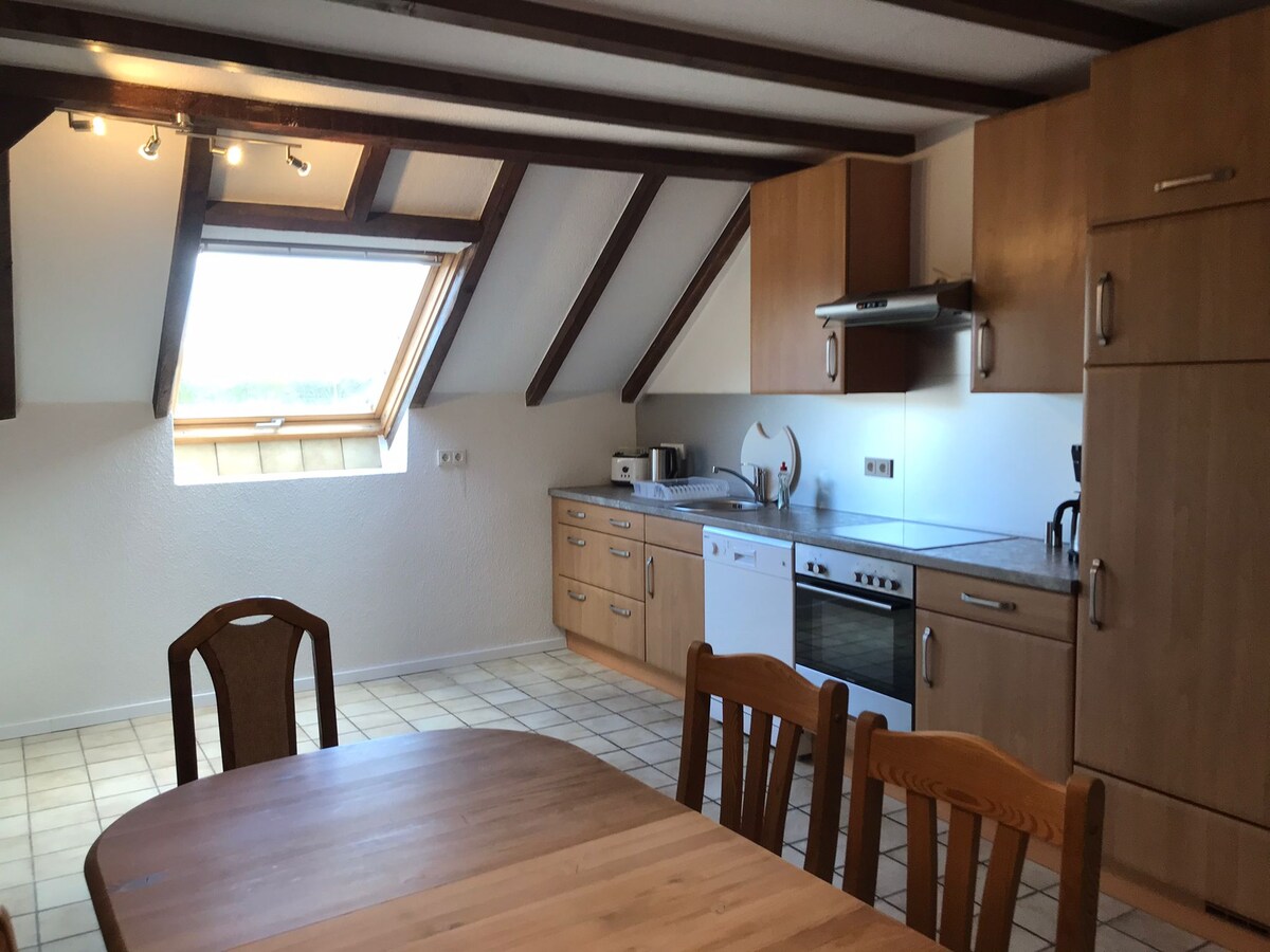 Tá a bhealach isteach féin ag an árasán 115 méadar cearnach in Tönisberg, le 2 spás páirceála. Is féidir líon a bhaint amach de shiúl na gcos agus tá tú ar an mórbhealach go tapa. Ar an mbalcóin, le cathaoireacha agus bord beag, is féidir leat do scíth a ligean sa tráthnóna agus tú ag baint sult as luí na gréine. Tá an t - árasán oiriúnach do mhadraí, ar féidir leat siúl go maith i bpáirceanna. Tá dhá leaba shingil, leaba dhúbailte agus tolg tarraingthe amach sa seomra suí. Is féidir leat féachaint ar an teilifís nó dairteanna a imirt.