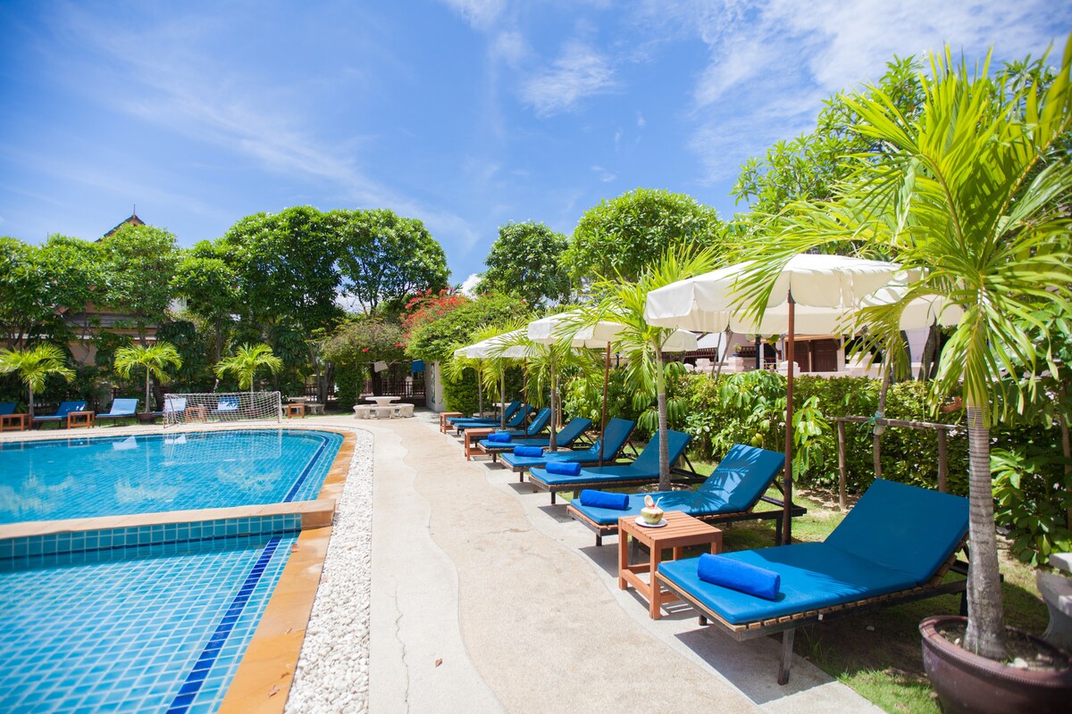 Suite i ngairdín lushing de limistéar sómasach in aice le Laguna, is teach aon stór é Villa Phuket a tógadh timpeall ar a linn snámha phríobháideach féin (40 méadar cearnach). Tá a seomraí folctha ensuite féin ag seomra leapa fairsing na banríona le tobán folctha agus táirgí orgánacha dea - mhéine. Radharc gairdín agus linn snámha. Seirbhís laethúil Maid. Is é ár misean síocháin agus compord a thairiscint maidir le nádúr na máthar agus ár bplainéad beloved. Freastalaímid ar bhricfeasta sláintiúil veigeánach blasta nach bhfuil san áireamh sa phraghas.