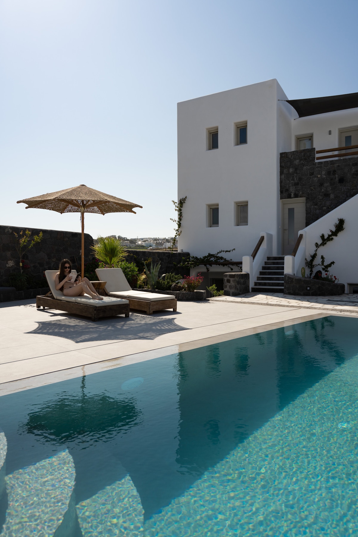 Tá an villa uathúil seo suite i gcroílár Oia i suíomh den scoth agus tá radhairc iontacha ann. Tá na Trí Chruinneachán cháiliúla díreach os comhair na villa le radharc lánléargais ag breathnú amach ar chaildréara Santórain agus ar mhuir na Máighdean, tarraingíonn siad cuairteoirí agus grianghrafadóirí ó gach cearn den domhan, rud a fhágann gurb é an áit is mó a bhfuil tóir air i Santórain. Tá an villa ag teacht go foirfe leis an timpeallacht nádúrtha sa cheantar agus leanann sé prionsabail ailtireacht thraidisiúnta na Cícláidéise.