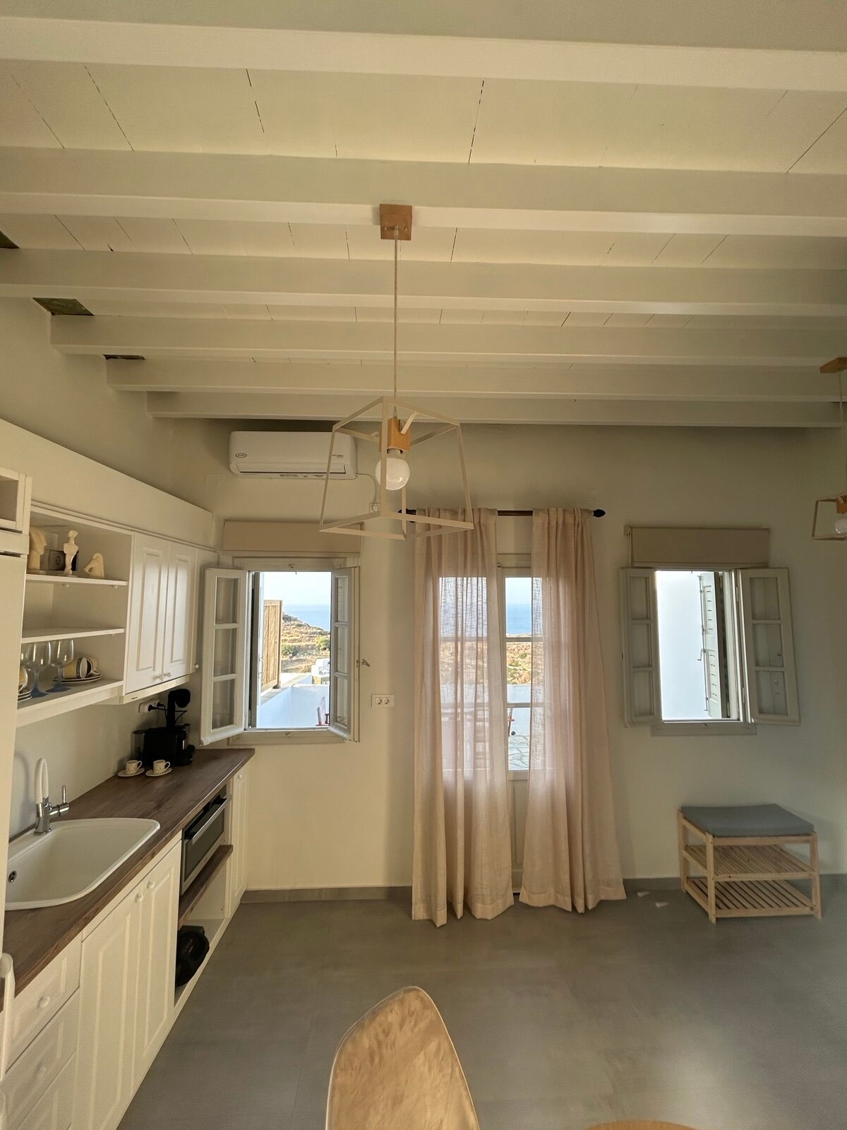 Bain sult as do shaoire samhraidh in Villa Lefteris. Tá radharc iontach ar an bhfarraige agus ar chalafoirt Sifnos, Kamares, ón árasán 50 mhéadar cearnach seo. Díreach os comhair an tí is féidir leat snámh a dhéanamh san uisce gorm glé. Ar an mbalcóin is féidir leat dílsiú a dhéanamh ar dhathanna iontacha na spéire an lá ar fad agus go háirithe le linn luí na gréine. Má tá tú ag brionglóideach faoi oícheanta suaimhneacha cois farraige, sin an áit cheart duitse. Tá ár n-árasán feistithe go hiomlán le sonraí maisiúcháin i stíl oileáin.