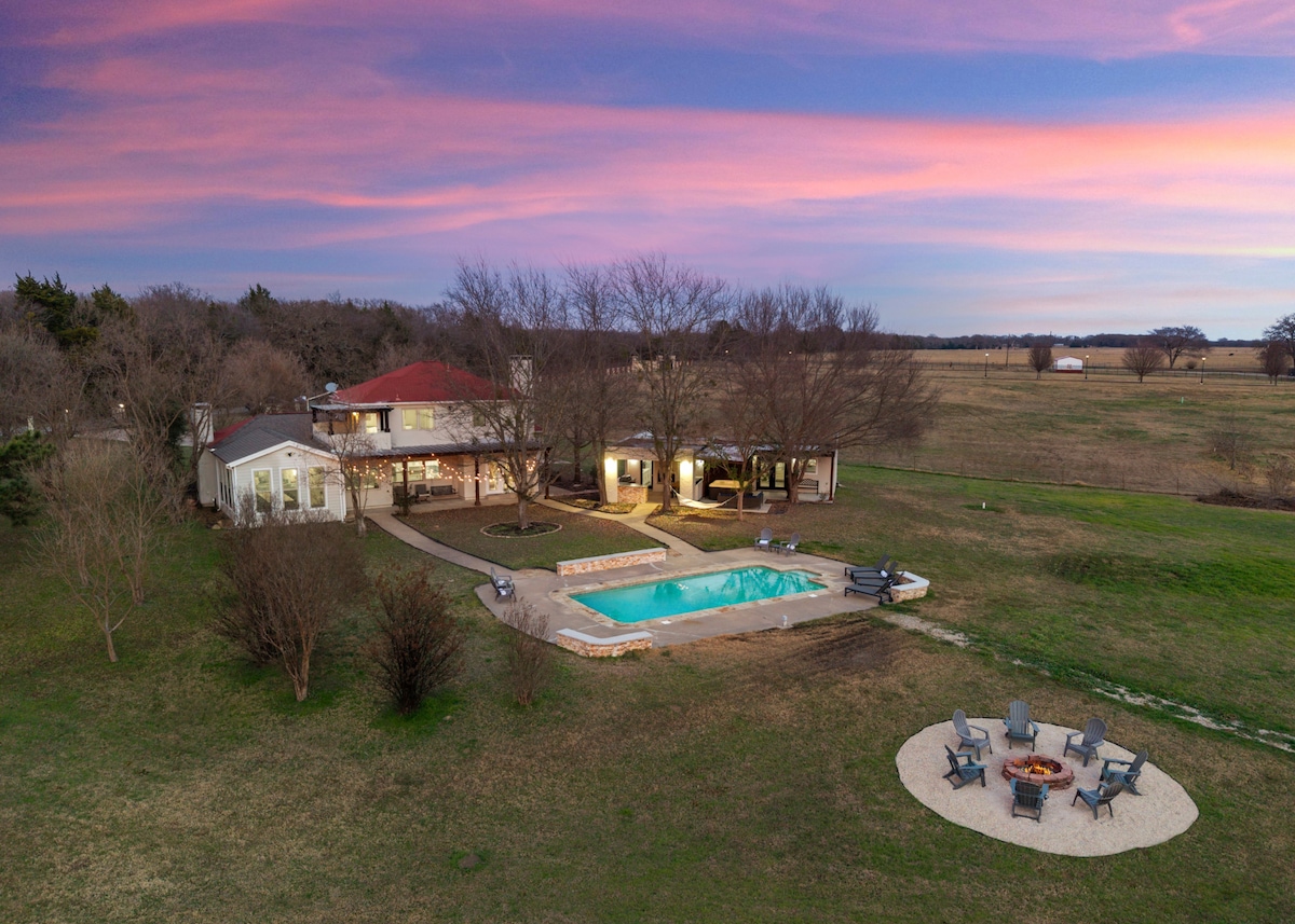 Fáilte chuig an Retreat Oasis! Téigh siar agus lig do scíth sa spás socair galánta seo. Neadaithe ar 38 acra, is é an teach nua - aimseartha 3 sheomra leapa seo an áit is fearr do do bhácáil, d'fhanacht nó do laethanta saoire. 35 nóiméad gearr ó lár Dallas, is é seo an tearmann foirfe chun imeacht ó ghnóthas agus ó ghnóthas na cathrach móire. Lig do scíth sa seomra 4 shéasúr, téigh ag spaisteoireacht ar an 38 acra nó téigh ag iascaireacht sa loch. Is é an Retreat Oasis an Getaway Foirfe.