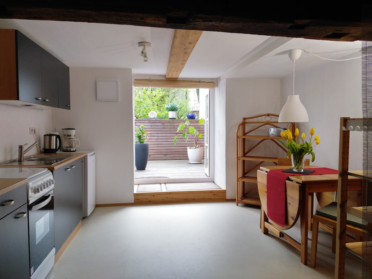 Tá an stiúideo compordach nua - athchóirithe ar urlár na talún i dteach traidisiúnta leath - uimhrithe (Fachwerkhaus). Cuireann sé thart ar 32.00 méadar cearnach de sheomra suí / bia ar fáil le leaba thoilg, seomra leapa le leaba dhúbailte, cistin bheag lánfheistithe agus seomra folctha. Is féidir le 1 -4 dhuine an stiúideo a áitiú. Cinntíonn fuinneoga ó urlár go síleáil soilsiú maith agus radharc tarraingteach ar an ngairdín ciúin, glas, ina bhfuil suíochán ar leith a bhaineann leis an stiúideo.