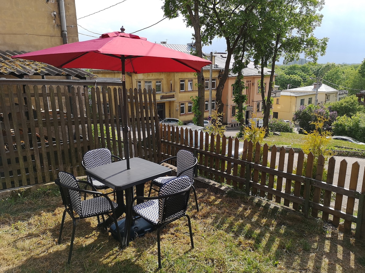Árasán fairsing (80 méadar cearnach) agus uathúil ina bhfuil ardán ~35 méadar cearnach, a thairgeann radharc lánléargais ar chathair Kaunas. Beidh cónaí ort ar an urlár uachtarach, gan aon chomharsana timpeall. Tá an t - árasán suite in aice le Páirc Kalniečiai. Tá rochtain mhaith ar Aerfort Kaunas freisin. Ar an ardán ar an díon, gheobhaidh tú áit bheárbaiciú agus troscán lasmuigh. Taobh istigh den árasán féin: teallach, folcadán mór cúinne, leaba dhúbailte, cuaille stróinséara, teilifíseán agus cistin lánfheistithe.