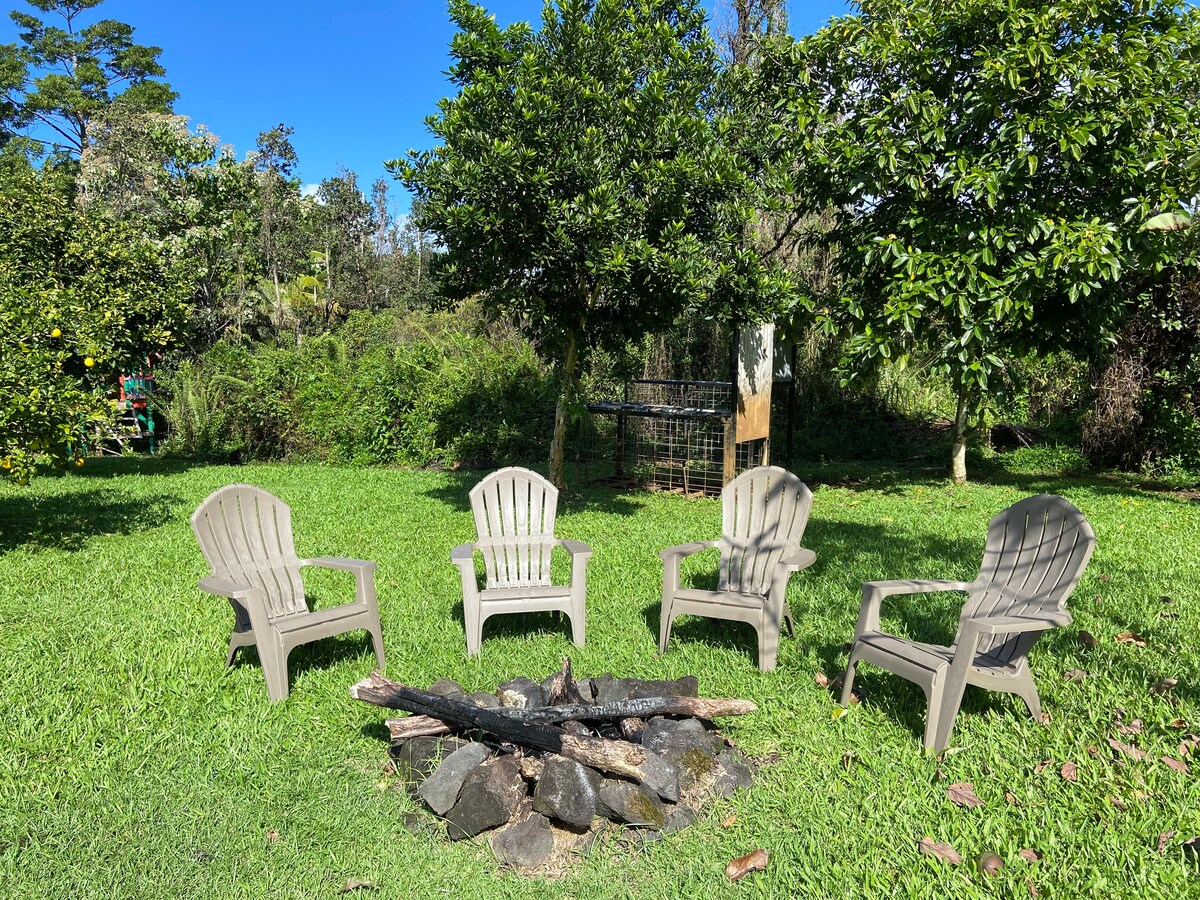 Mauna kea view. 600 troigh ar airde. An chéad urlár leaba banríona agus Tolg. Tábla. Loft leaba futon iomlán. Cuir bac ar Chuirtíní. Athrófar bileoga i gceann seachtaine le haghaidh fanacht fada. Tá Cáin☆ Haváí SAN ÁIREAMH. Tabhair tuáillí trá ar iasacht. Maidin Caife & tae curtha ar fáil. Tá córais UV againn le haghaidh uisce sábháilte. Meaisín níocháin sa phríomhtheach (Saor in aisce) Bolcán Páirc Náisiúnta40 nóiméad siar, Mauna kea 1.5 uair siar ó thuaidh, tránna Hilo 30 nóiméad soir. Táille bhreise $ 15 do gach duine os cionn 2 bhliain d'aois.