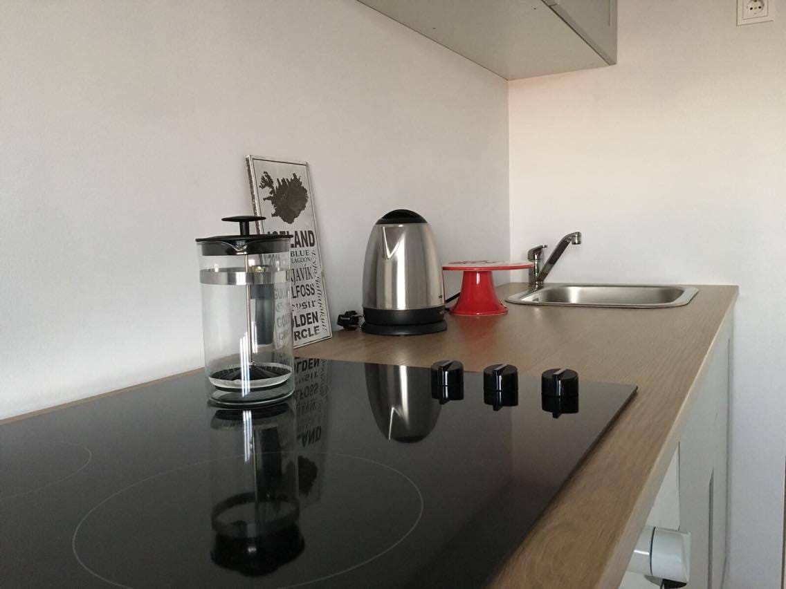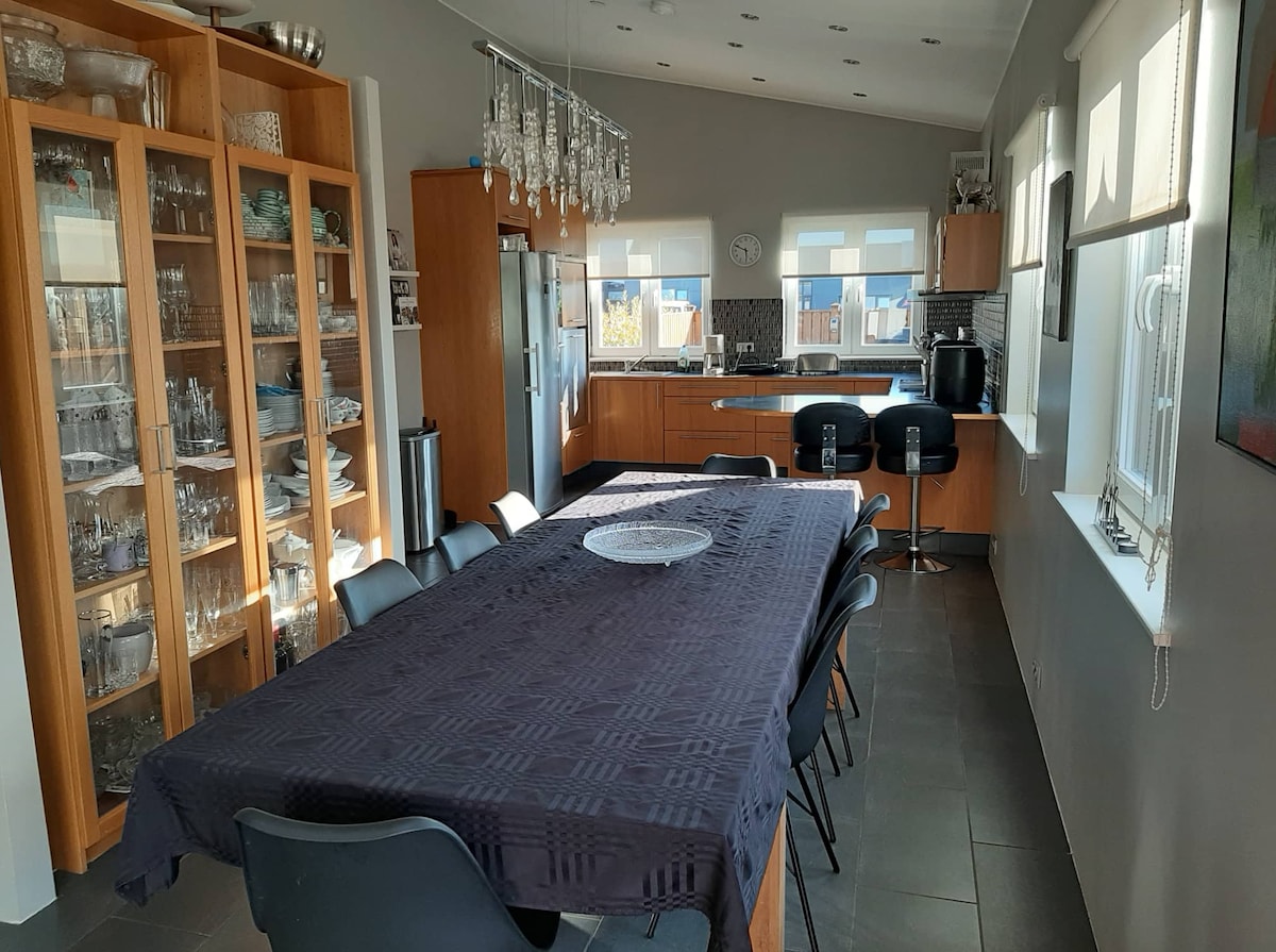 Tar chuig do theach ar shiúl ón mbaile le radhairc iontacha ar Sunsets Nordach agus Soilse an Tuaiscirt Glorious díreach amach ó d'fhuinneog. Uaireanta is féidir leat breathnú ar mhíolta móra ag súgradh sa chuan nó ar an spleodar ar an tsráid thíos ó d'árasán GO HIOMLÁN príobháideach, LÁNFHEISTITHE. In aice leis an bpríomhshráid i mbaile beag Keflavik. Tá tú 3.5 km ón aerfort, siúlóid nóiméad chuig siopaí, bialanna, siopaí grósaera agus 15 nóiméad (sa charr) ó Murlach Gorm. Tar mar Adventurer, Fág mar Chara
