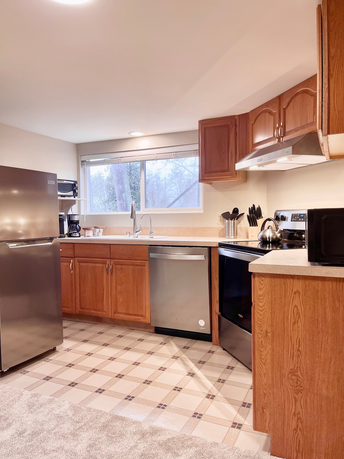 Teach aíochta 750sf a bhfuil dea - cheaptha ann. Áit mhór itheacháin cistine. Seomra leapa ar leith. Seomra fóntais le triomadóir niteoirí lánmhéide. Cistin iomlán gourmet: fearais cruach dhosmálta. Cuntair eibhir. Seomra leapa lena n - áirítear vardrús iomlán, drisiúr, leaba bhanríona. Neart línéadach tí ardchaighdeáin. Seomra folctha iomlán, tobán breise. Téamh agus AC. Teilifís HD le cábla caighdeánach ar fáil. Wi - Fi ardluais. Bealach isteach príobháideach slán. Gan peataí ná daoine a chaitheann tobac.