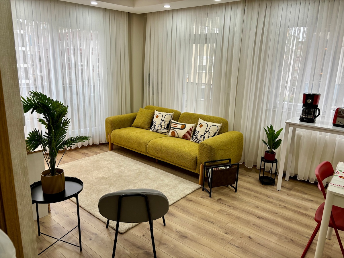 ✨ Modern ve şık tasarımlı bu 1+1 daire, mükemmel konumuyla konaklamanızı kolaylaştırır. Restoranlara, marketlere ve toplu taşımaya birkaç adım mesafededir. Sessiz ve güvenli bir apartmanda yer alır; konforlu yaşam alanı, tam donanımlı mutfak 🍳 ve yüksek hızlı internet 📶 ile hem iş hem tatil için premium bir deneyim sunar. 🌟