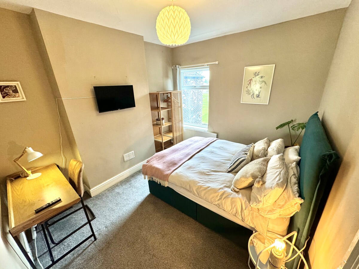 The room is newly refurbished and overlooks the back garden on a quiet leafy street in Old Trafford. The bed itself has a new 10 inch thick mattress ensuring the weary traveller has an excellent nights sleep ! You will wake up to the sound of birdsong:) There is a large kitchen and dining area, a day room on the first floor and a shared bathroom/toilet. There is 1 additional person in the adjacent bedroom