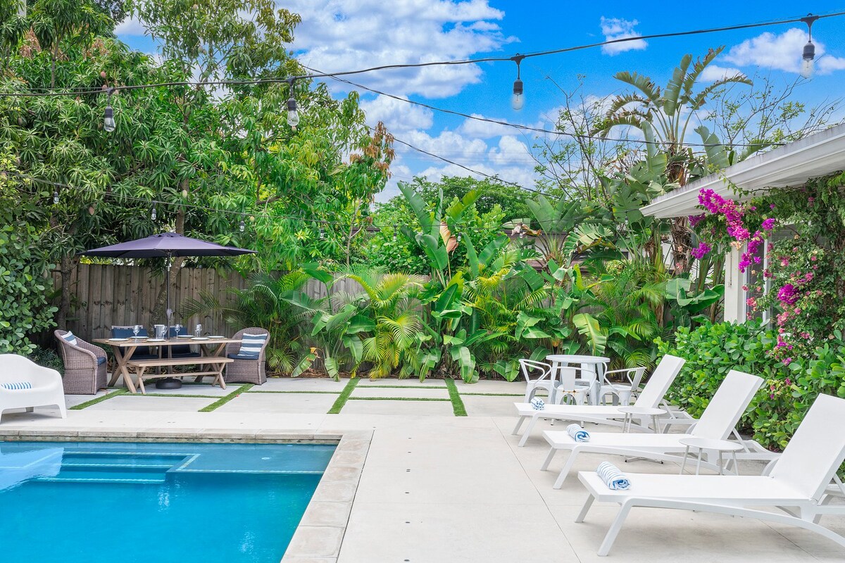 Oáis Nua-Aimseartha i bPáirc Shuaimhneach Victoria | Linn Snámha Phríobháideach | In aice leis an Trá & Las Olas. Tairgeann an coincheap nua-aimseartha oscailte, plean urláir aonair spás te fáilteach do do theaghlach nó do do chairde chun taitneamh a bhaint as do theach sa Fhlóirida theas agus chun cuimhní cinn a mhaireann a chruthú. Gar don aerfort (15 nóiméad), gar don trá (10 nóiméad), gar do Los Olas agus do shiamsaíocht oíche lár na cathrach (10 nóiméad).