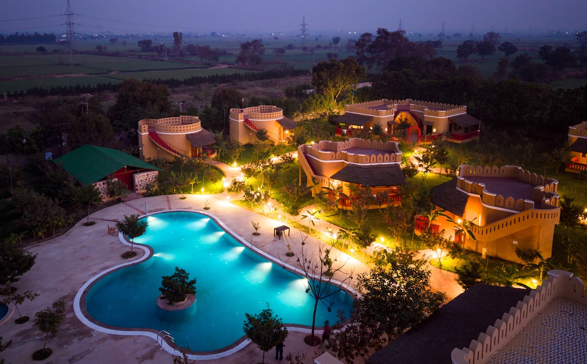 Nestled in a forest‑surrounded 12‑acre resort — a rustic‑Mediterranean suite awaits amidst fruit‑and‑vegetable gardens, offering peaceful reprieve. Relax in a cozy 322 sq.ft. cottage‑style room with a king‑size bed, wooden accents, soft lighting, private patio, and a terrace with serene views. Enjoy poolside lounging, two expansive gardens each of 1-acre approx., a tree‑house machan, and Tuscan‑style dining. Ideal for families, couples.
