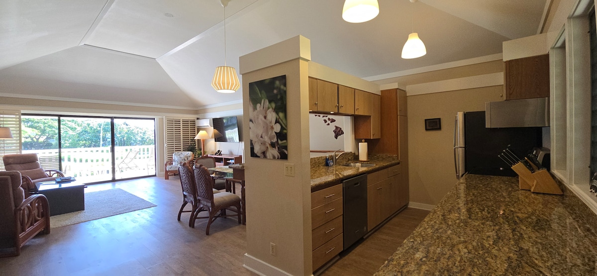 Fáilte go dtí Sunny Poipu Beach! Cuireann an t - aonad álainn 2ú hurlár seo ag Plandáil Kiahuna ar do shuaimhneas thú! Lig do scíth ar do lanai príobháideach ag breathnú amach ar an ngairdín agus tú ag dul chuig an ngaineamh. Tá spotaí surfála, siúlóidí fada agus trá faoi gharda tarrthála ar do shuaimhneas. Wi - Fi tapa 200mgb, cistin lánstóráilte, páirceáil saor in aisce, seiceáil isteach 24 uair an chloig gan stró le cárta eochrach, leaba ar mhéid rí, seomra folctha iomlán agus lanai ró - mhór le bord bia agus cathaoireacha tolg ar an lanai freisin.