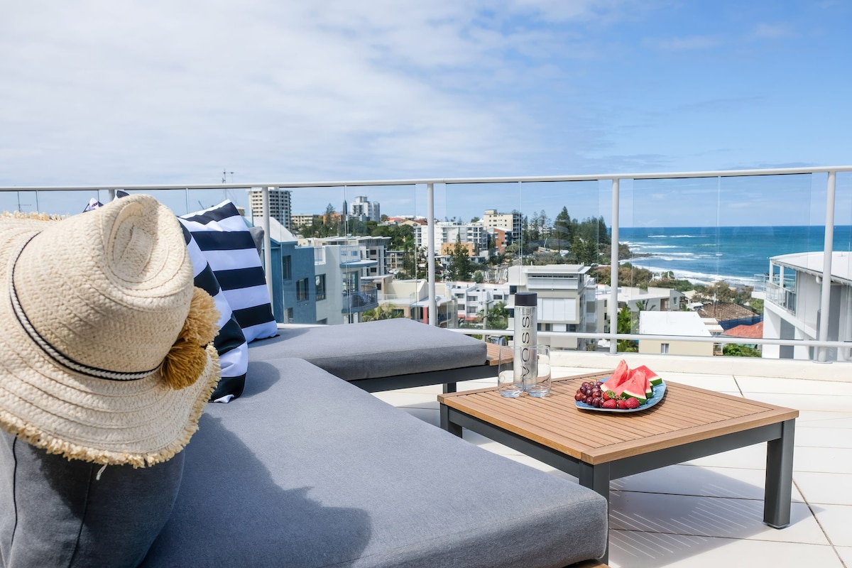 Enjoy spectacular views across Kings Beach & beyond from this stylish & spacious fully air-conditioned (ducted ) apartment. Take advantage of this central location where beaches, parks,cafes,markets,cinemas,shops and restaurants are only a short stroll away or just relax on the balcony with beautiful sea breezes .Whether surf beaches or rockpools are your speed-it's all right here. A perfectly appointed apartment with hi speed wifi,smart TV,comfy beds, full kitchen & BBQ for the perfect stay.
