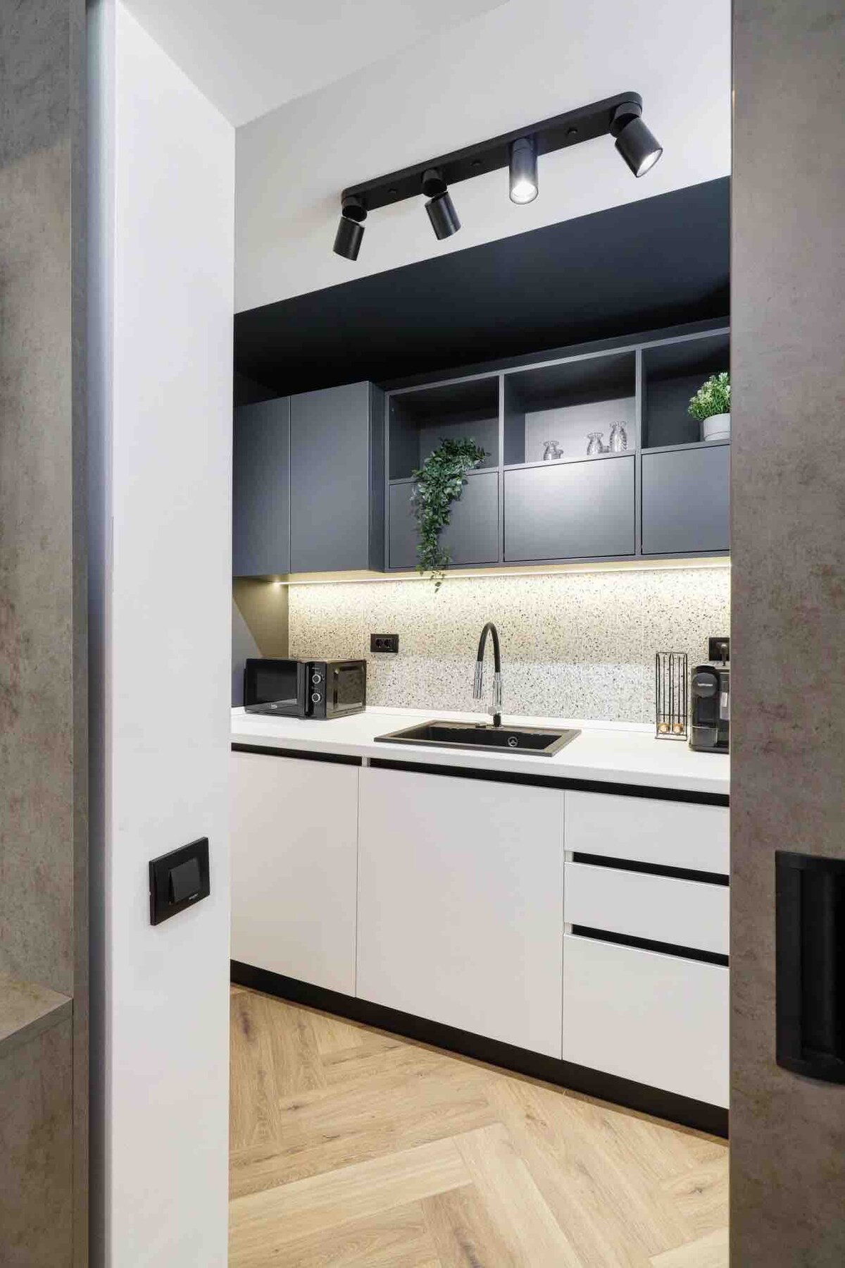 Ceann de na tionscadail phearsanta is gaire dom! Tá an t - árasán álainn aon seomra leapa seo suite ar cheann de na boulevards is tábhachtaí i gcroílár Búcairist - Calea Victoriei. Tá go leor staire ag baint leis, a theastaigh uaim a choinneáil agus a athbheochan. Mar a dhéanaim i m'árasáin go léir, choinnigh mé an t - urlár álainn adhmaid, a leagadh síos ag baint úsáid as teicníc nach n - úsáidtear a thuilleadh agus gné amháin eile a ligim duit a fháil amach. Inseoidh sé sin duit beagán faoi na mná a bhí ina gcónaí ann. Athraíodh gach rud eile go hiomlán.