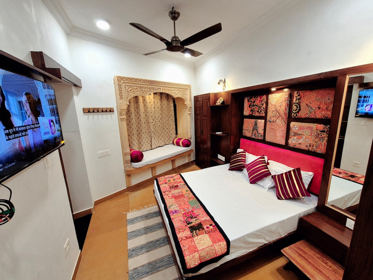 Tá bia baile ar fáil ach é a iarraidh freisin — ionas gur féidir leat taitneamh a bhaint as fíorbhlasanna áitiúla le linn d'fhanachta! Fáilte chuig ár dteach traidisiúnta álainn 1BHK i gcroílár Jaisalmer — níl sé ach 10 nóiméad ar shiúl ó Patwa Haveli agus 2 km ó Loch cáiliúil Gadisar. Téigh isteach i spás a mheascann traidisiún Rajasthani le compord nua - aimseartha. Bain sult as an limistéar fairsing comhluadair ina bhfuil inar féidir leat do scíth a ligean agus féachaint ar do chuid seónna is fearr leat ar Netflix tar éis lá fada ag spaisteoireacht.
