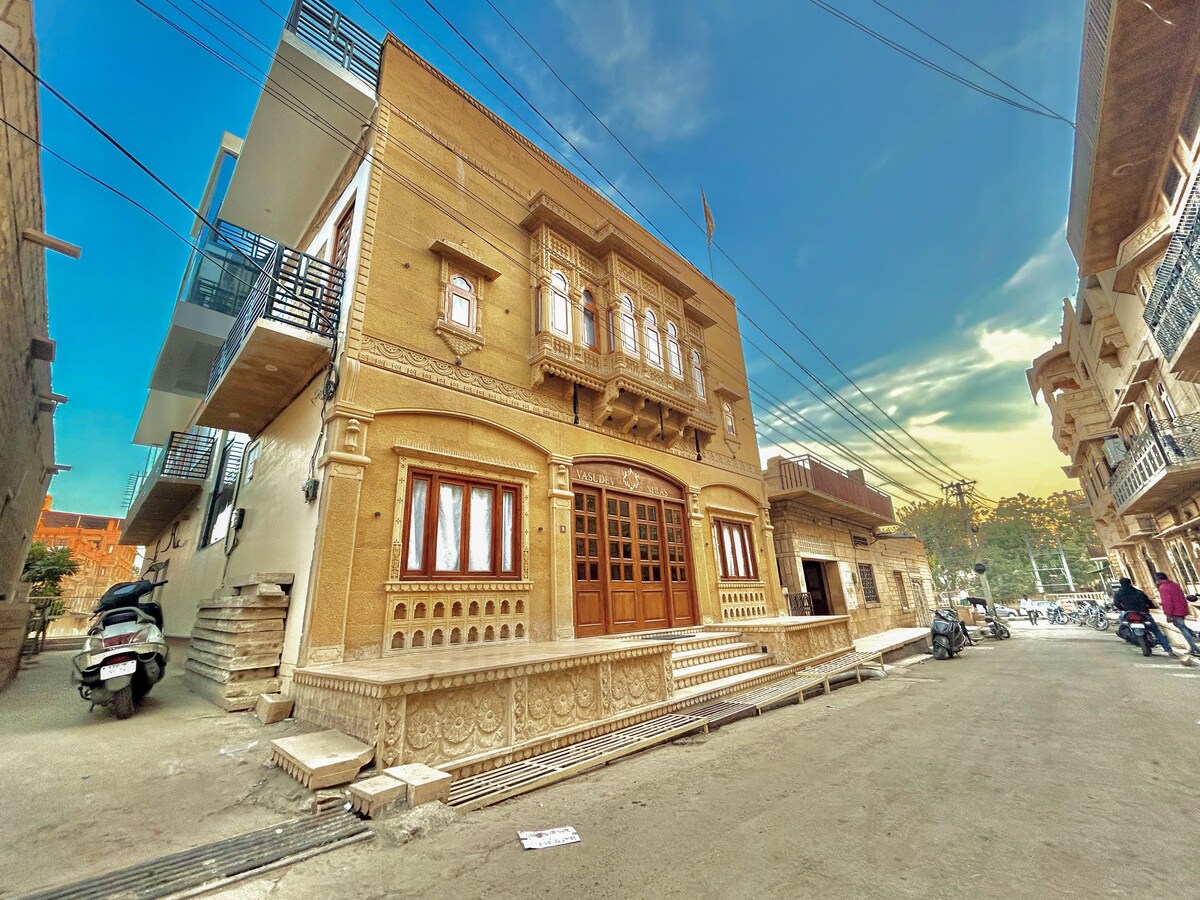 Fáilte, Is Jaisalmer Haveli bunaidh (áit chónaithe thraidisiúnta, maisithe go hórnáideach) é ár n - áit. Tá sé go hálainn ar fud le vibe Desert - met - comhaimseartha. Tá trí sheomra mheánaoiseacha ag Haveli atá maisithe i ndathanna beoga buí, aoil agus glas, agus cuireann gach ceann acu dea - cheaptha le leapacha compordacha na saoráidí is fearr sa lá atá inniu ann agus ardán atá feistithe go maith ar fáil. Tá seomraí folctha fairsinge glana marmair Jaisalmer deartha go maith le compord nua - aimseartha. Is bónas iad na háiteanna coiteanna