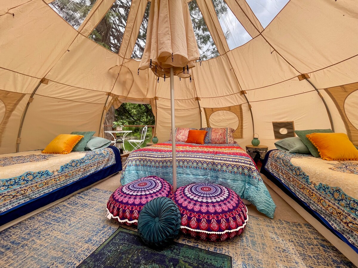 Is eispéireas Glampála é an Canopy. Neadaithe taobh amuigh den bhaile, ach gar do lár na cathrach, siopaí agus eachtraí. Eispéireas campála uathúil le teagmháil nua - aimseartha chompordach. Soláthraíonn sé puball fairsing canbháis, ar dheic, faoi cheannbhrat na ndúlra. Kitchette iomlán, 2 leaba iomlána, asraon cumhachta, leithreas, tolglann lasmuigh, áit shruthlaithe i stíl champála, go leor páirceála agus mothú tí! Tá uisce óil Mt Shasta ar an gCanopy agus caife áitiúil déanta de láimh le gach fanacht. ♡