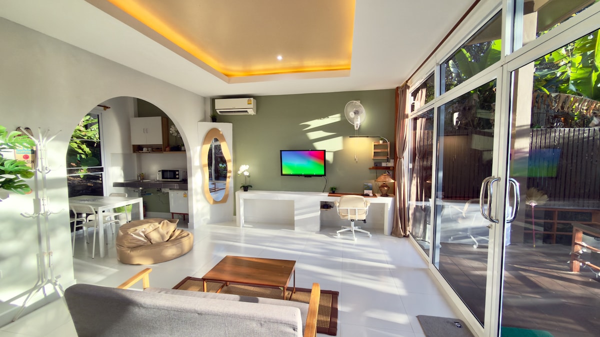 Fáilte go dtí ár saoire ghearr thrópaiceach ar oileán iontach Koh Mak! Cuireann ár dteach gleoite 2 sheomra leapa an meascán foirfe de chompord agus só ar fáil do do thearmann oileáin. Tá an teach suite i gceantar cónaithe síochánta nach bhfuil ach 5 nóiméad siúil ón tsráid ard agus 3 nóiméad ar shiúl ón trá! Atá feistithe le linn snámha agus aerchóiriú i ngach seomra, beidh tú cinnte go mbeidh an áit fhoirfe agat chun deireadh a chur leis tar éis lá taiscéalaíochta ar an oileán.