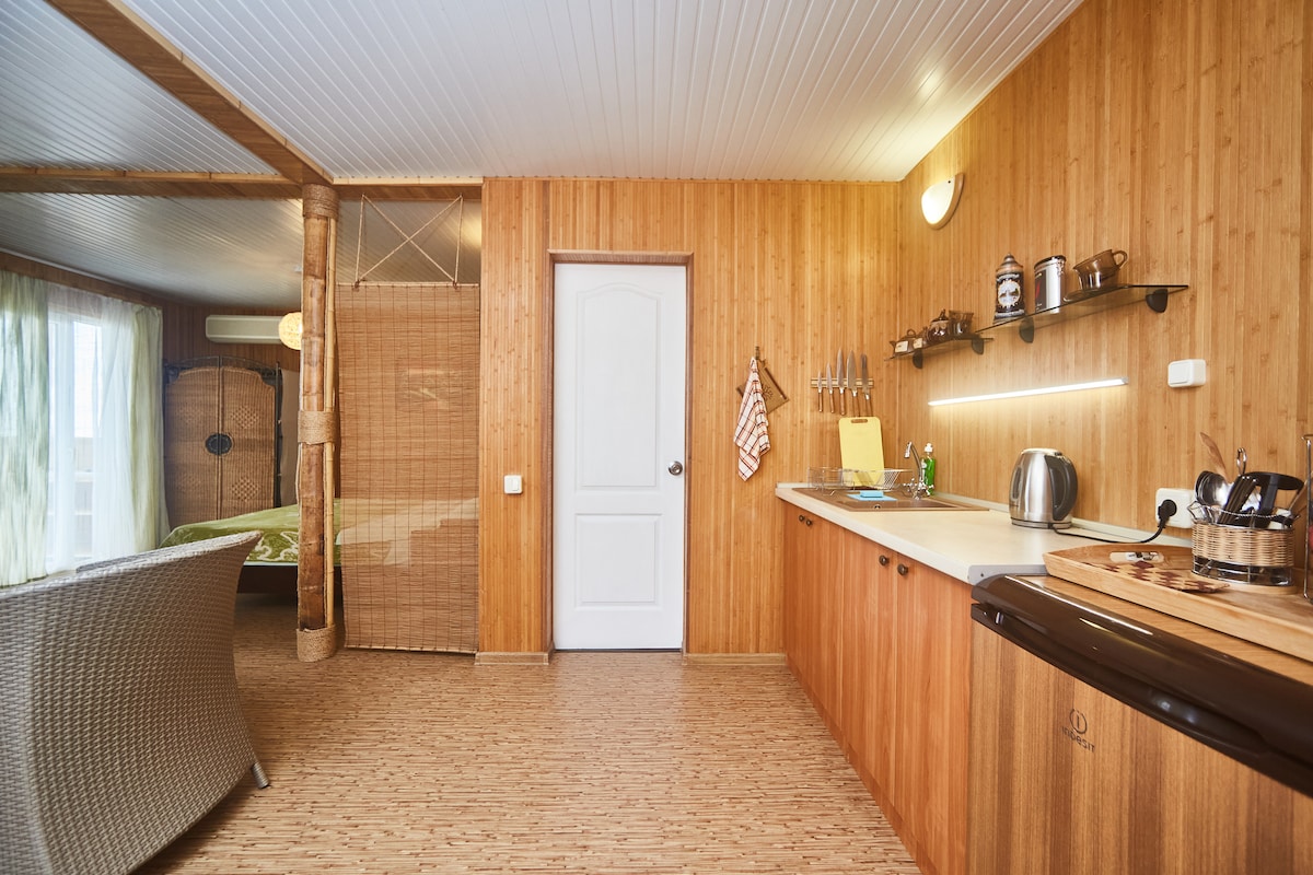 Le haghaidh scíth agus athbhútáil rómánsúil, chomh maith le haghaidh saoire chiúin agus teaghlaigh le páistí, cuirtear teach compordach le dearadh nua - aimseartha údair ar fáil. Bailchríocha taobh istigh déanta as ábhair atá neamhdhíobhálach don chomhshaol (bambú agus adhmad). Tá rochtain ag aíonna ar linn snámha, ar bheárbaiciú , ar chlós súgartha le sleamhnán , ar chasáin agus ar thrampailín. Tá áit luí na gréine ann ina bhfuil tolgairí gréine agus cithfholcadán úrnua. Beidh an linn snámha ar siúl ón 1 Meitheamh go dtí an 30 Meán Fómhair Lóistín le peataí de réir mar a aontaíodh.