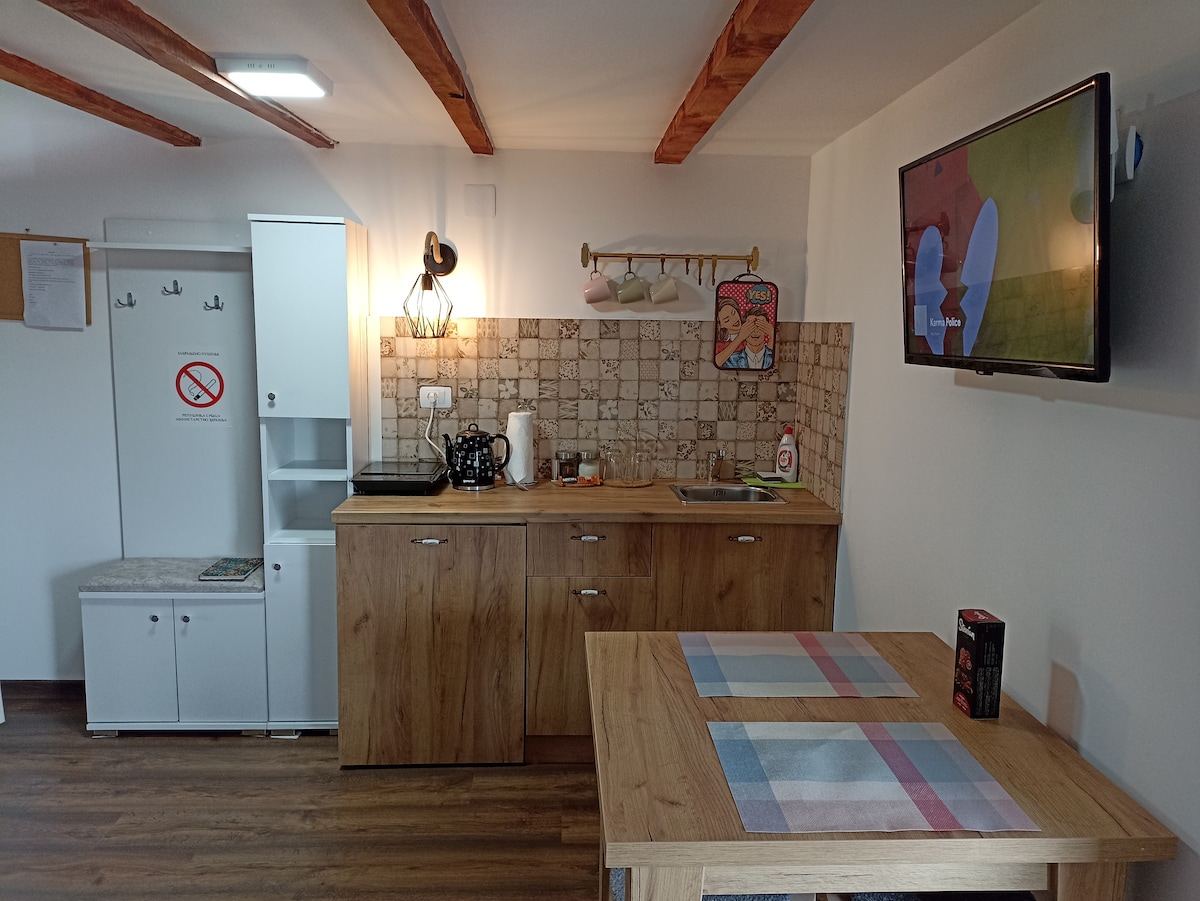 Tá an t - árasán suite i lár na cathrach, chomh luath agus a théann tú amach as an bhfoirgneamh tá tú ag príomhchearnóg Šabac. Is é 55m^2 méid an árasáin, is é leagan amach na seomraí ná cistin ina bhfuil seomra bia, seomra folctha, seomra suí agus seomra leapa. Rinneadh athchóiriú iomlán ar an árasán in 2025, aistríodh isteach é le troscán iomlán nua. Tá caife ann nach bhfuil ach 20 m ar shiúl, bialann 50 m ar shiúl, agus margadh 150 m ar shiúl.