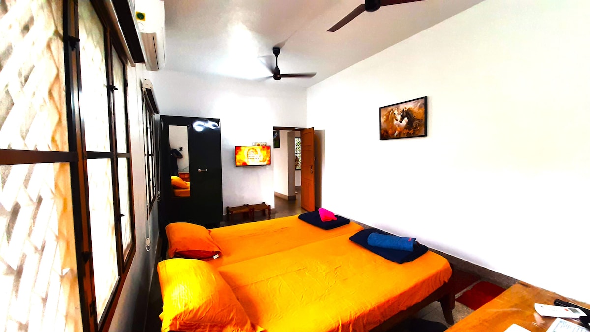 TITHE DAVID - Near Fort kochi Beach Walkable distance. Tarraingítear aird ar an réadmhaoin mar gheall ar a hatmaisféar síochánta intíre, agus í gar do gach ceann scríbe! 230 troigh chearnach seomra glan fairsing le LEABA TEAGHLAIGH AR MHÉID RÍ en - suite cistin phríobháideach bhunúsach chomh maith le spás dinnéir ceangailte agus cuisneoir faoi ambiance socair agus suaimhneach. Cuirimid spás maireachtála ar fáil duit laistigh de chóngaracht níos lú ná 100 m do thrá Fort kochi agus do gach díol spéise íocónach cultúrtha ar fud!!;]