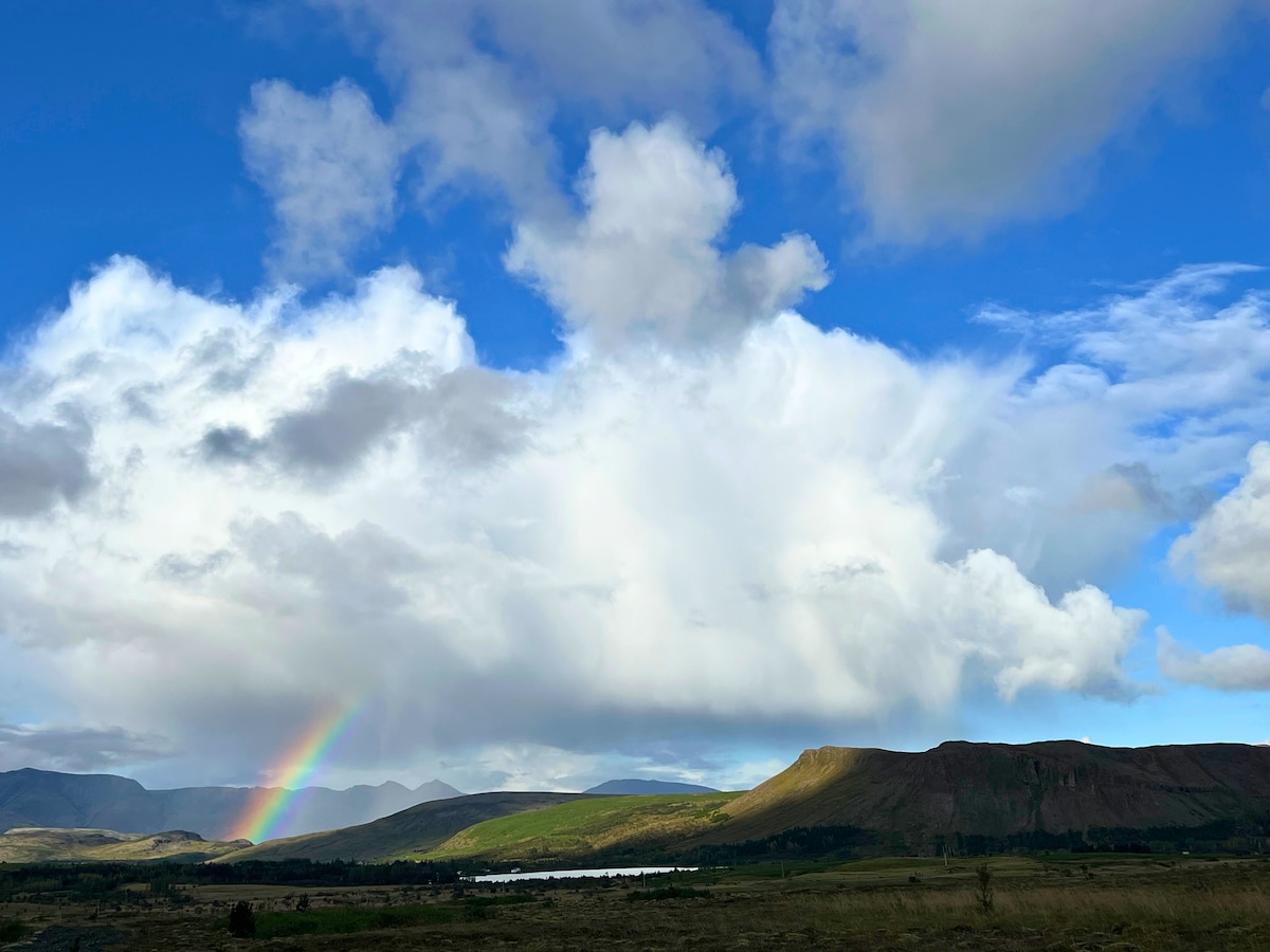 Árasán stiúideo atá suite ar fheirm ach 20 nóiméad ó Reykjavík!:) ar an mbealach chuig an gciorcal órga a chuireann spás ar fáil do bheirt. Tar agus fan ag ár bhfeirm agus tabhair cuairt ar ár n - ainmhithe iontacha agus/nó faigh ubh úr ónár sicíní ar maidin chun cócaireacht a dhéanamh san árasán. Tá eispéiris spraíúla timpeall ár bhfeirm freisin, mar shampla a lán cosáin áille fánaíochta, marcaíocht capall agus go leor eile. Is suíomh an - mhaith é chun turais lae a phleanáil uaidh. Má tá soilse ó thuaidh is féidir leat a fheiceáil díreach taobh amuigh den doras.