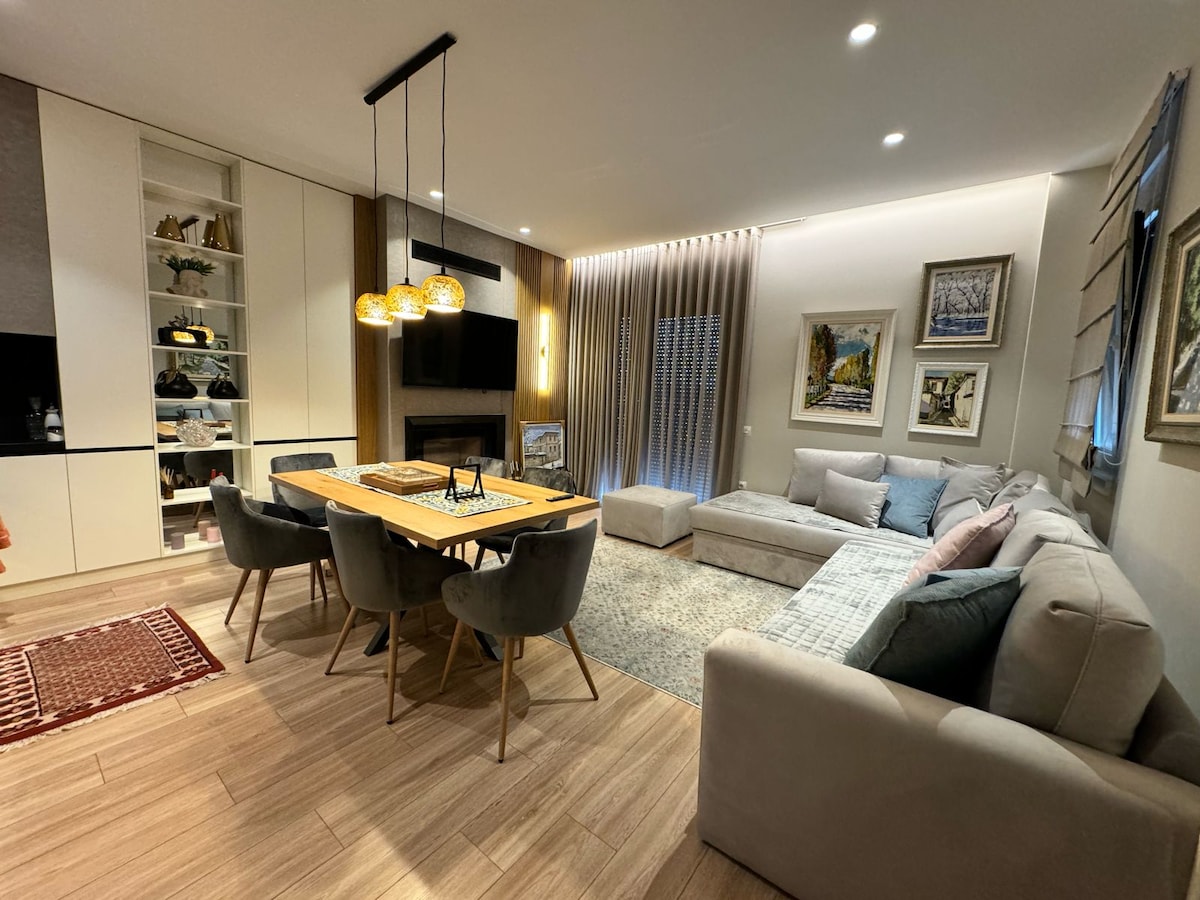 Welcome to your perfect getaway in the charming city of Korçë. This beautifully designed 1-bedroom apartment comfortably hosts up to 3 guests and combines modern elegance with a cozy, inviting atmosphere. The apartment is fully furnished with a contemporary interior, featuring clean lines, warm tones, and stylish décor. The highlight of the living area is a modern fireplace, creating a relaxing and intimate ambiance — perfect for chilly Korçë evenings.