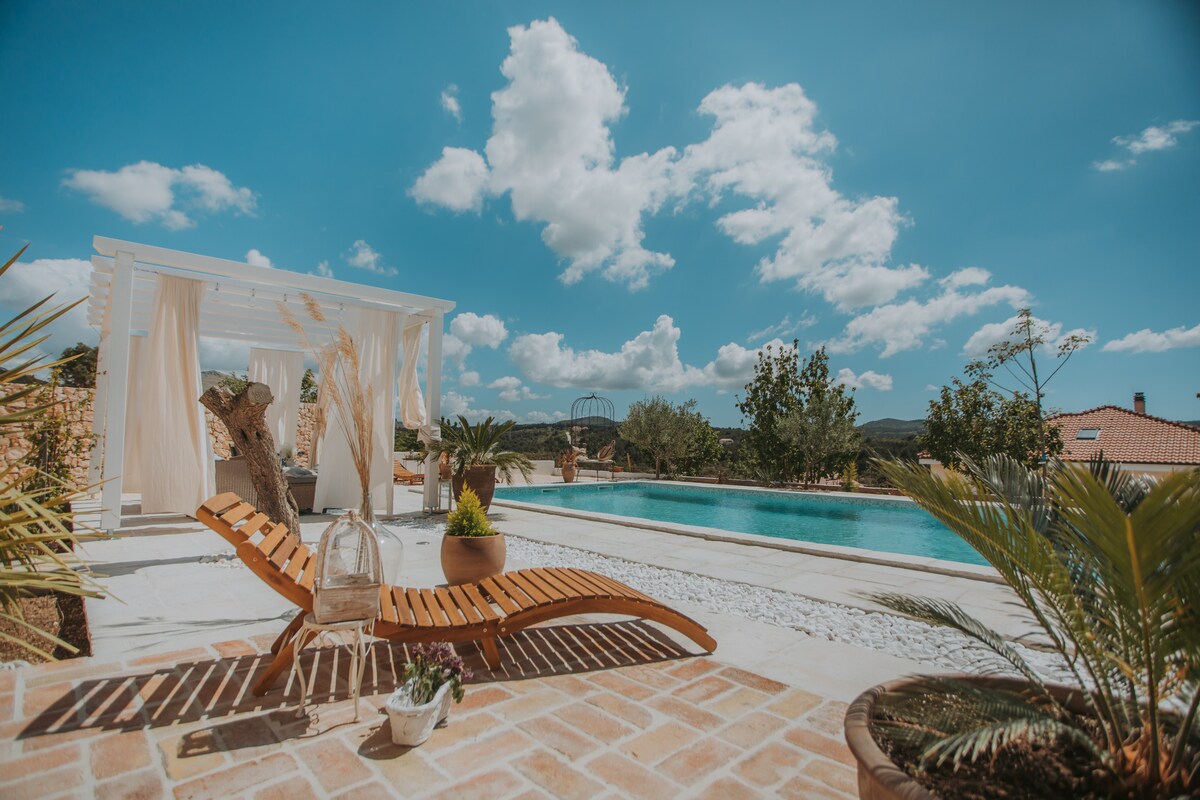 Villa gleoite cois farraige le radhairc ar an bhFíonghort, linn snámha théite agus cistin samhraidh Fáilte chuig áit ina mbuaileann draíocht nádúr na Meánmhara le compord íon, villa atá neadaithe idir an fharraige agus an fíonghort, ag tairiscint éalú uathúil díreach taobh amuigh de Scoilt. Tá fíonghort príobháideach os comhair an tí, ag fánaíocht go réidh i dtreo na Mara Aidriad atá ag glioscarnach. Ón mbalcóin, osclaíonn do radharc go dtí an gorm gan deireadh, cathair stairiúil Scoilt i gcéin, agus na hoileáin Dalmatian ar na bacáin.