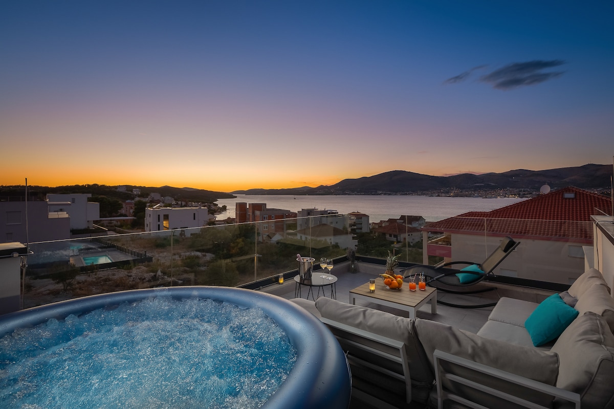 Tá Árasáin ar Mhuir suite ar shuíomh foirfe in aice láimhe Trogir, díreach ar an trá, agus an radharc is fearr ar an bhfarraige agus ar na hOileáin áille Aidriadacha. Is ceantar síochánta agus ciúin é. Os comhair an tí tá promanáid 3 chiliméadar ar fad cois farraige, ina bhfuil óstaigh chairdiúla agus bia sláintiúil i mbialanna beaga Meánmhara. Tá árasáin ina bhfuil suíomh iontach agus rochtain an - éasca ar Trogir (seanbhaile álainn ina bhfuil rogha mhór bialanna ar phraghas réasúnta) agus Scoilt trí thacsaithe báid.