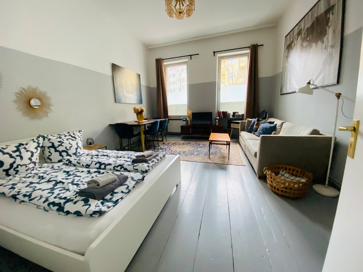 Ag maireachtáil i siopa nua-athchóirithe! Árasán beag i gcomharsanacht fhaiseanta Neukölln. Nóiméad ó stáisiún U + S-Bahn Neukölln (200m) agus ó Stáisiún Meitreo Shráid Herrmann (600m). Tá seomra leapa amháin san árasán ina bhfuil 2 leaba shingil (200x90cm), limistéar suí ina bhfuil bord itheacháin agus tolg ar féidir é a fhilleadh amach ina leaba dhúbailte chompordach (200x160cm). Teilifís 32 orlach agus nasc WLAN / LAN le suas le 50 Mbit. Tá cistin bheag le cuisneoir agus teopláta, agus seomra folctha le cith ar fáil freisin.