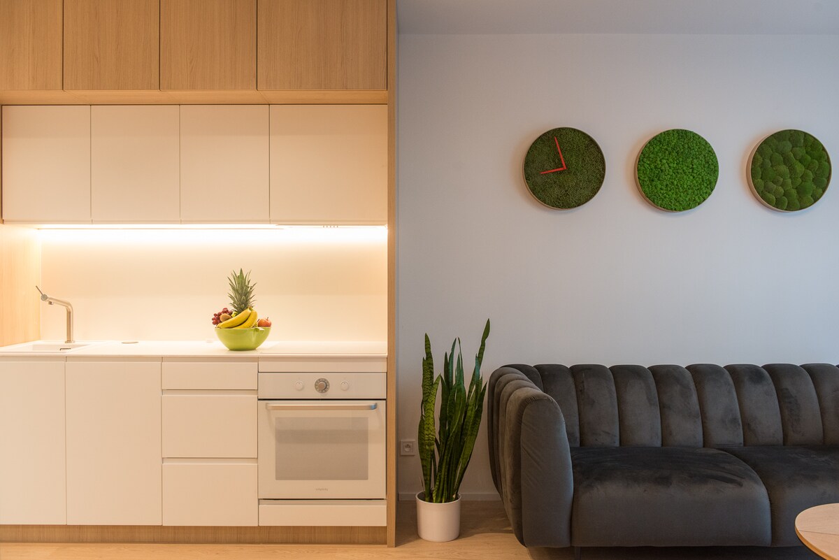 Cuireann d'árasán galánta nua fanacht compoird ar fáil do suas le beirt. Tá sé suite in eastát nua díreach nóiméad laistigh de lár an bhaile. Tá an áit feistithe go hiomlán (fearais chistine, Wi - Fi, Antik Smart TV, srl.) agus tá sé réidh le haghaidh d'fhanachta. Cuirtear páirceáil saor in aisce ar fáil i spás ainmnithe faoi thalamh. Cuireann cuideachta slándála phríobháideach sábháilteacht na réadmhaoine agus na n - aíonna ar fáil.