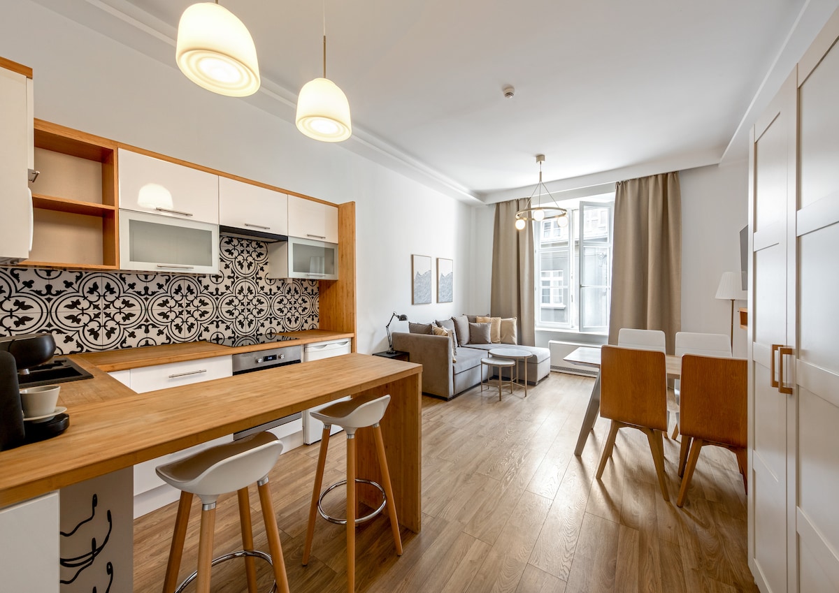 Ciceáil siar ar tholg cabriole seanda i limistéar maireachtála lán le solas adorned le rugaí sheepskin agus feistis seanré. Tugann na haicinn agus na rudaí beaga íostacha ar fud na háite atmaisféar eicléictiúil ar iasacht don spás athmhúnlaithe seo. Tá an t - árasán suite i dteach tionóntáin ón naoú haois déag, i Seancheantar an Bhaile idir an Phríomhchearnóg agus seancheantar na Ceathrún Giúdach. Téigh ag spaisteoireacht trí na sráideanna speisialta ar a bhfuil siopaí seandachtaí neamhghnácha, dánlanna ealaíne suimiúla, agus caiféanna shabby - chic.