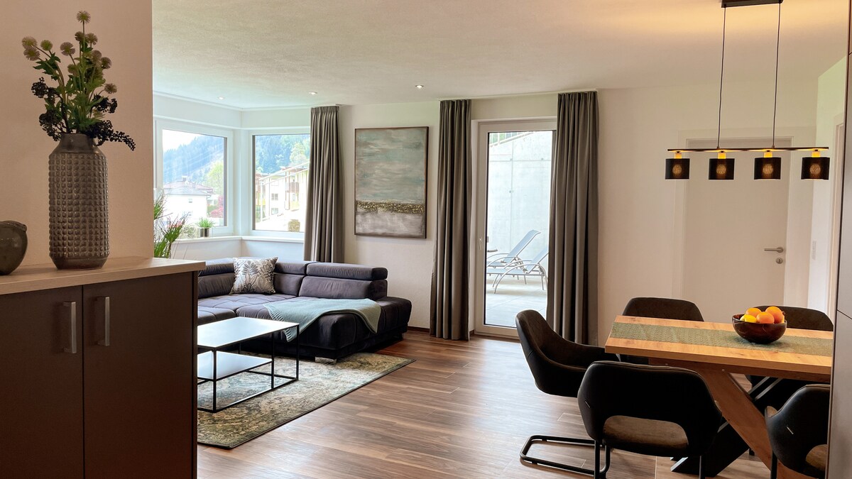 100m² appartment saoire feistithe ardchaighdeáin ar dhá leibhéal i dteach ailtirí a tógadh go horgánach in Alpa Kitzbühel ar Sonnberg i ngleann ard Wildschönau le naisc le ceantar sciála Kitzbühel agus seod Sciála Wildschönau le radhairc iontacha sléibhe os cionn féarach beag alpach. Is féidir ár leaba lasmuigh a dhéanamh sa Gheimhreadh freisin. Tá sabhna speisialta lasmuigh againn freisin. duitse amháin. is féidir leat taitneamh a bhaint as radharc iontach ar an mbaile Niederau ó gach leibhéal.