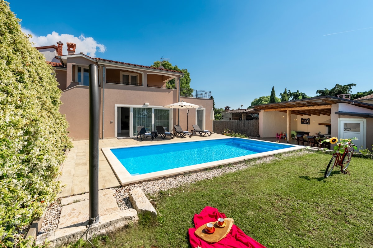 Villa galánta in aice le Rovinj le linn snámha atá fíoráille, tobán te, seomra allais. Múscail agus radhairc mhóra ar an ngleann lán de dhraíocht. Oiriúnach do lánúineacha agus do theaghlaigh, turas gairid go páirc eachtraíochta, Páirc Náisiúnta Brijuni, dinopark, bailte meánaoiseacha agus bia áitiúil. Is fíor - éalú glas é do dhuine ar bith atá ag iarraidh filleadh ar an dúlra le compord uile na maireachtála nua - aimseartha. Feistithe go hiomlán le haghaidh cócaireachta agus siamsaíochta i 2600 m2 de ghairdín (peil, liathróid luais, badmantan & spraoi linn snámha) do do pháistí agus do dhaoine muinteartha chun taitneamh a bhaint as.