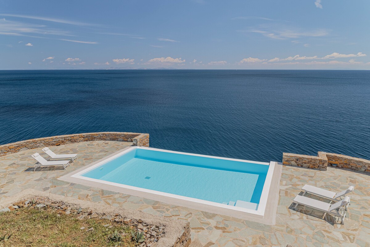 Villa uathúil, ag barr chnoc Panagia, áit inar féidir leat áilleacht agus suaimhneas na Mara Aeigé a fheiceáil i bpríobháideacht iomlán. Tá an villa suite ar an gcuid thoir theas de Kythnos, áit a mbaineann aíonna taitneamh as éirí na gréine le radharc ar Syros agus ar na hoileáin Chiocladach máguaird gach maidin.