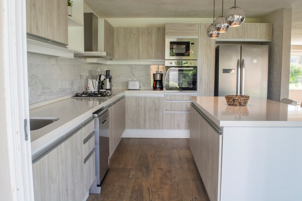 Teach suite i gcroílár La Barra, i gceantar cónaithe ciúin, 400mt ó thrá La Posta del Cangrejo agus ón gceantar siopadóireachta, ó bhialanna agus ó bheáir. Tá seomra mór bia ann atá comhtháite sa chistin, le fuinneoga móra ag breathnú amach ar an tsráid agus ar an ngairdín. Teach atá os comhair ó thuaidh, an - gheal. Is féidir leat taitneamh a bhaint as an linn snámha lasmuigh (téite ó Shamhain go Márta), beárbaiciú faoi dhíon le troscán lasmuigh, Wi - Fi, teilifíseán Cliste 65 orlach faoi stiúir.